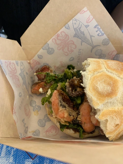 폴리냐노 아 마레에 도착했지만 오전부터 에너지를 너무 많이 써서 일단 점심을 먹기로 했다. 바리 근처 바다에서는 문어가 많이 잡히는지 문어를 사용한 음식을 종종 만날 수 있는데, 그중 문어 버거를 먹기로 했다. 맛은 크게 기대하지 않았는데 의외로 문어와 빵이 잘 어울렸다. 거기다 맥주와, 젤라또까지 먹으니 다시 걸을 힘을 얻을 수 있었다.
