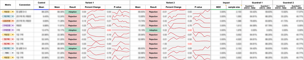 앞서 설명한 Percent Change, P-value, MDE(Minimum Detectable Effect), Sample size, Guardrail을 모두 검토하여 최종적으로 결과를 채택(Adeption)할지, 기각(Rejection)할지 여부를 한눈에 확인할 수 있는 영역입니다.