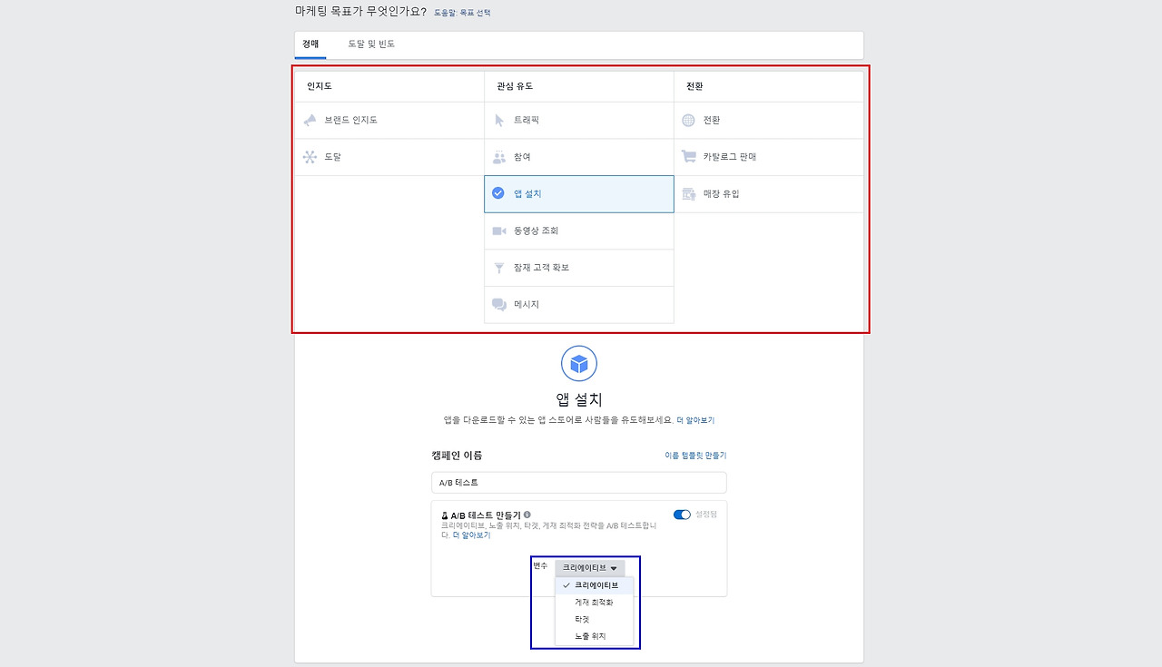 앞서 설명했듯이 테스트 결과를 더욱 정확하게 측정하기 위해서 페이스북 A/B 테스트는 종속변수와 독립변수 모두 한 가지만 선택이 가능합니다.