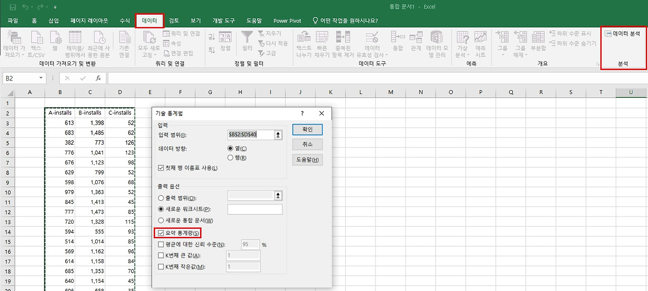 데이터(리본 메뉴) > 분석(리본)의 데이터 분석 > 기술 통계법 > 입력 범위 지정 > 요약 통계량 체크 > 확인