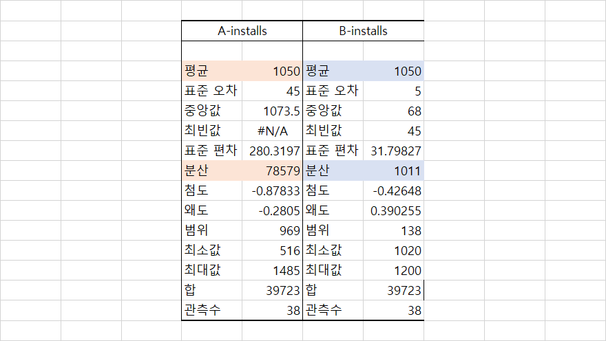 아래 데이터는 A, B 미디어의 일간 앱 설치수를 Excel 데이터 분석의 기술 통계량 기능을 활용하여 출력한 데이터입니다.