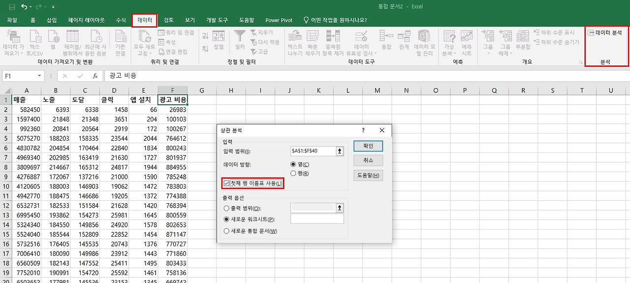 데이터(리본 메뉴) > 분석(리본)의 데이터 분석 > 상관 분석 > 입력 범위 지정 > 첫째 행 이름표 사용 체크 > 확인