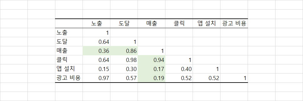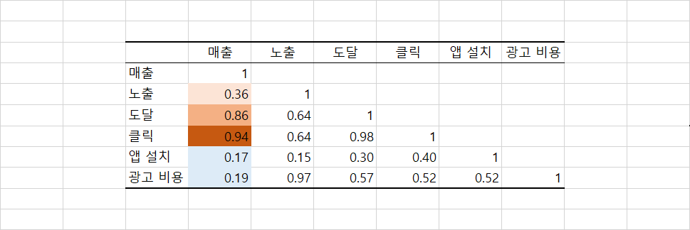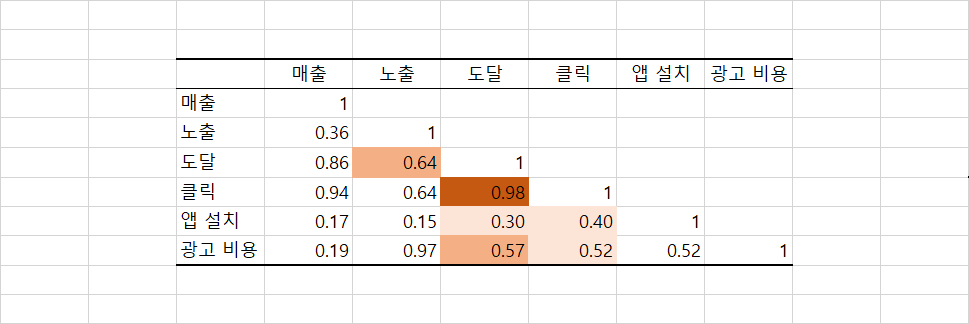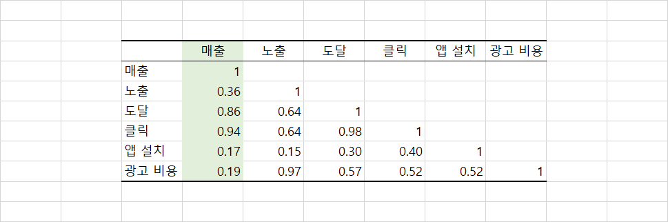 출력된 데이터를 확인하면 행과 열에 각각 매출, 도달, 클릭, 앱 설치, 광고 비용이라는 동일한 변수가 적혀있습니다.