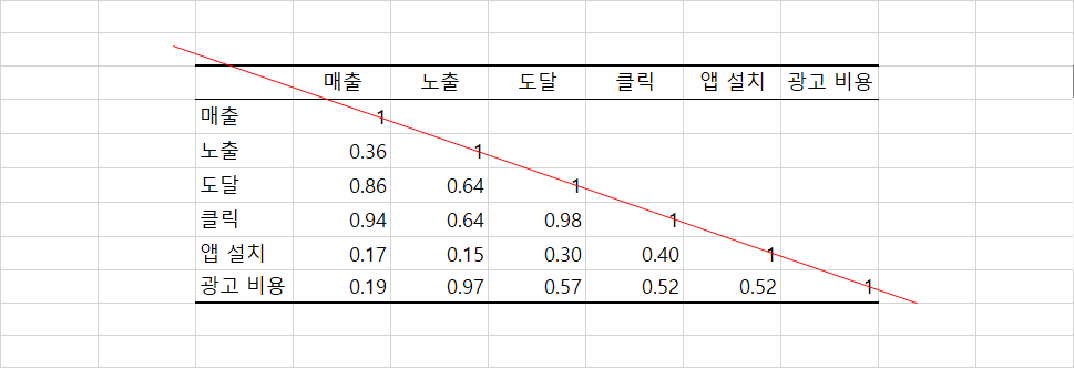 제가 임의로 1이 있는 부분에 빨간색 대각선을 그어 놓았는데, 이 부분은 매출과 매출의 상관 관계, 노출과 노출의 상관 관계 등 동일한 변수들 간의 상관관계를 나타내고 있기 때문에 상관 계수가 1로 표시가 되는 것입니다.
