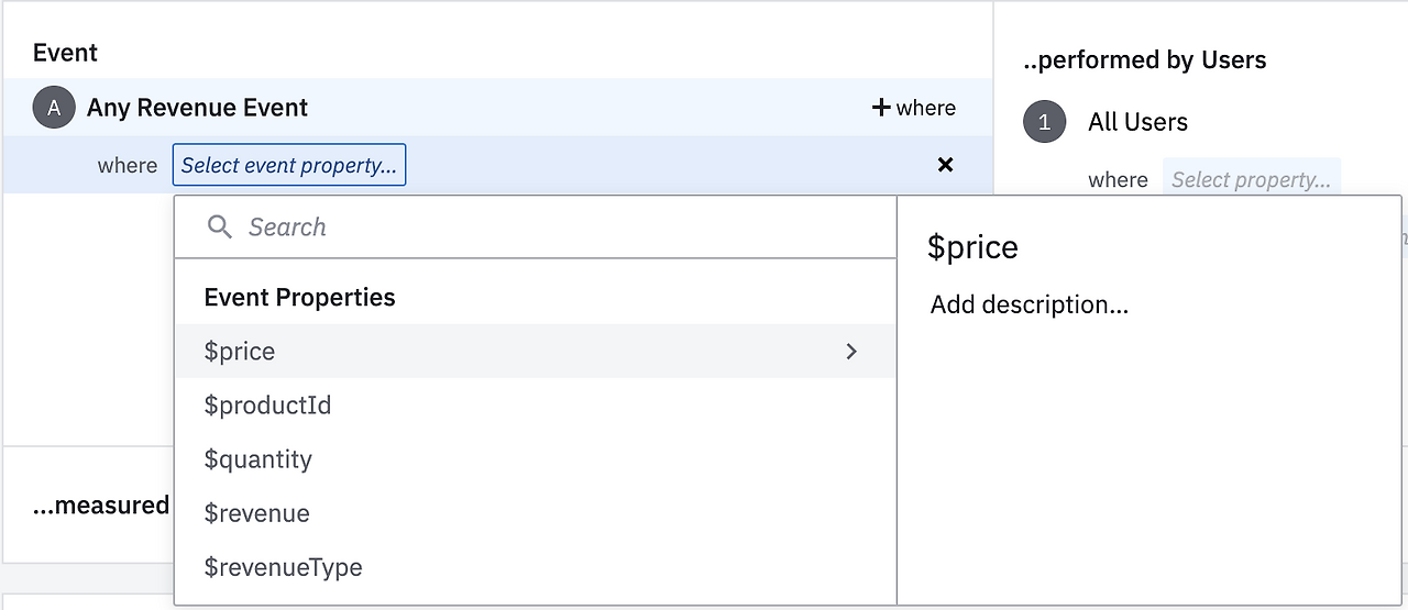 단, where을 통해 Event Properties를 선택하여 원하는 조건을 선택할 수 있습니다.