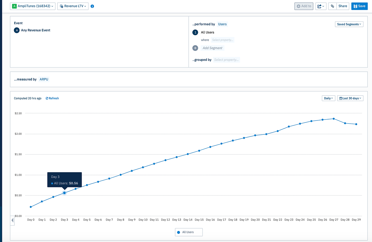 위 결과의 경우 지난 30일간의 New Users의 3일 차 ARPU가 $0.56이라는 것을 알 수 있습니다.