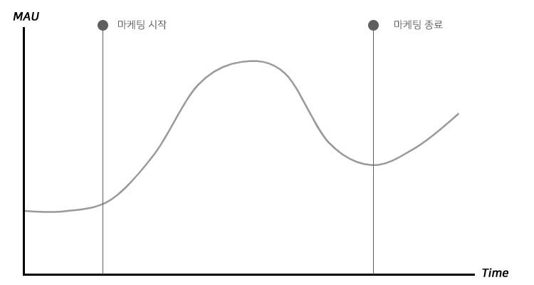 마케터라면 아마 대부분 아래 그래프처럼 비용 집행을 통해 유입을 확대하였으나, 비용 집행이 끝나는 순간 바로 유입이 줄어드는 현상을 경험해 보셨을 것입니다.