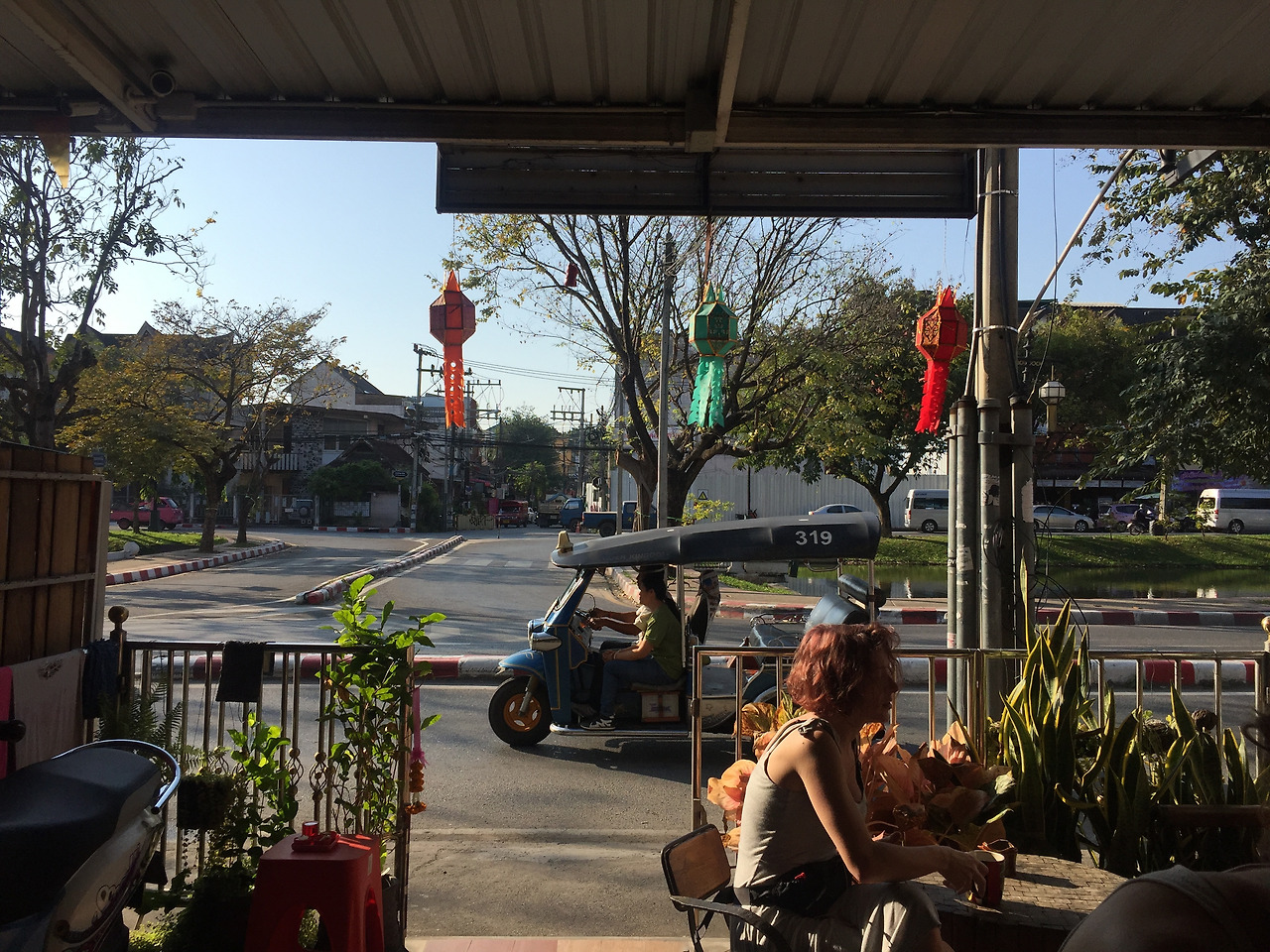 느지막이 일어나 샤워하고 일층으로 내려와 보니 간단하게 조식을 먹을 수 있게 음식이 준비되어 있었다. 토스트와 인스턴트커피, 바나나와 사과. 우리는 적당히 집어 호스텔 현관 밖에 앉아 먹으며 치앙마이의 아침을 보았다.