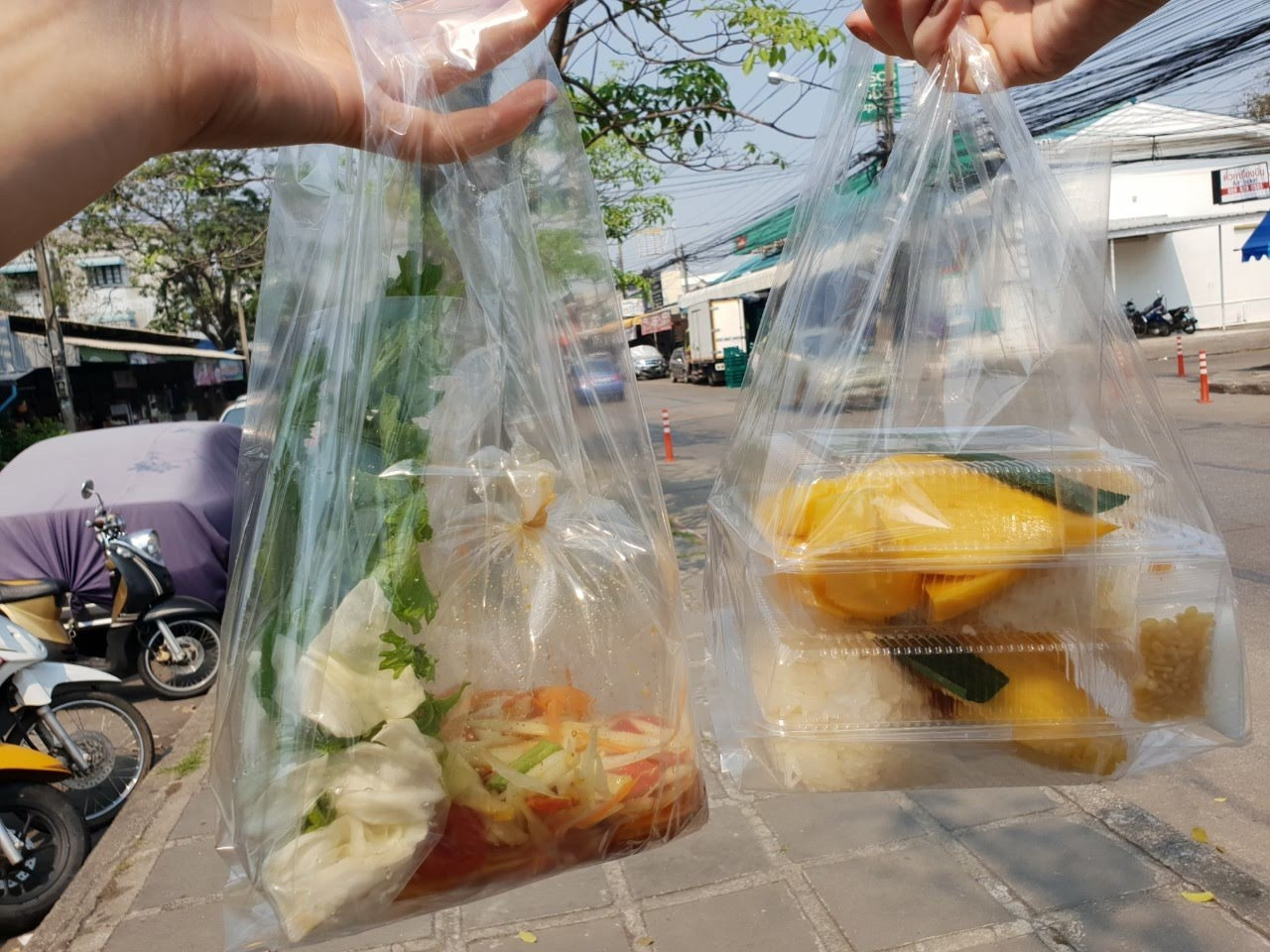 태국은 스트릿 푸드의 천국, 야시장의 천국이고 똠얌꿍 팟타이 천국이다. 직접 재료를 사 집에서 요리해 먹는 것보다 거리 상점, 시장에서 뚝딱 만들어져 파는 음식이 맛도 있고 싸기도 엄청 싸다. 음식을 사면, 각종 다양한 비닐과 일회용 용기에 음식과 추가 옵션 재료들을 나누어 깔끔하게 담아준다. 비닐과 동시에 태국은 플라스틱(비닐 포함)의 천국이다. 비닐의 아낌없고 다양한 쓰임에 놀란다. 비닐봉지와 고무줄만 있으면 포장이 안 될 음식이 없다. 국물이 있든 없든, 차갑든 뜨겁든 모든 것이 포장된다.