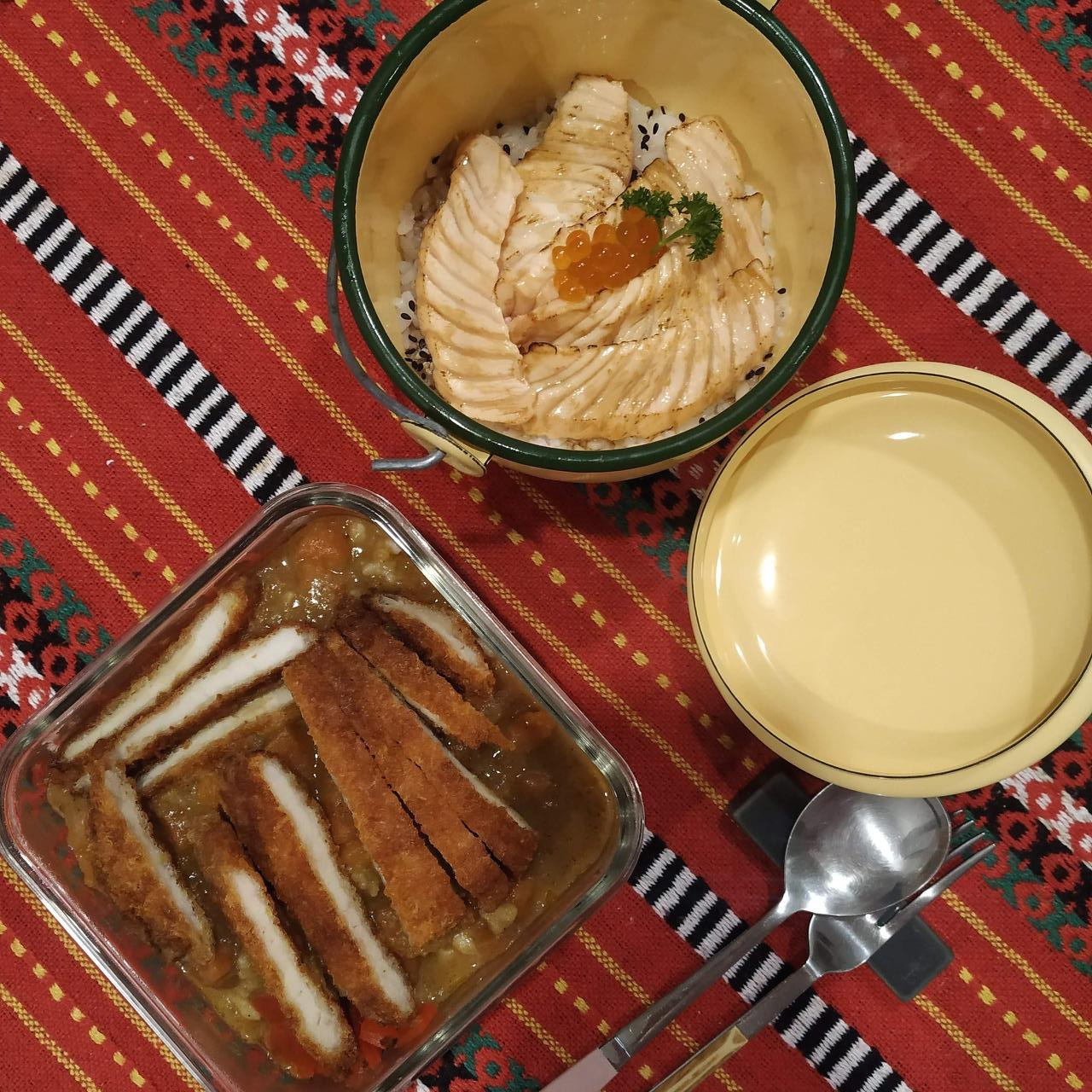 연어동 + 카레 돈가스 = 일회용 용기 2 + 이걸 함께 담아줄 큰 비닐 1