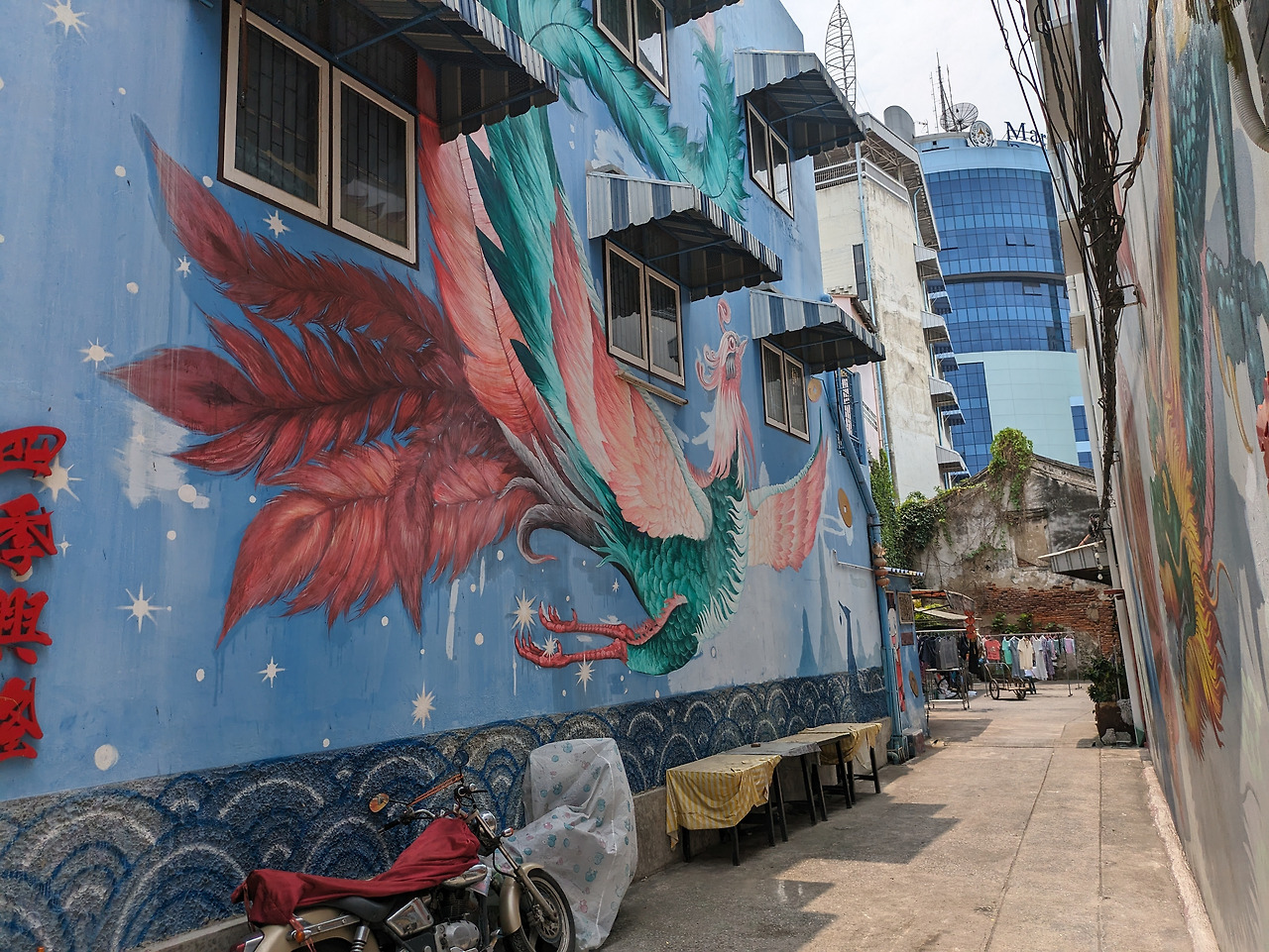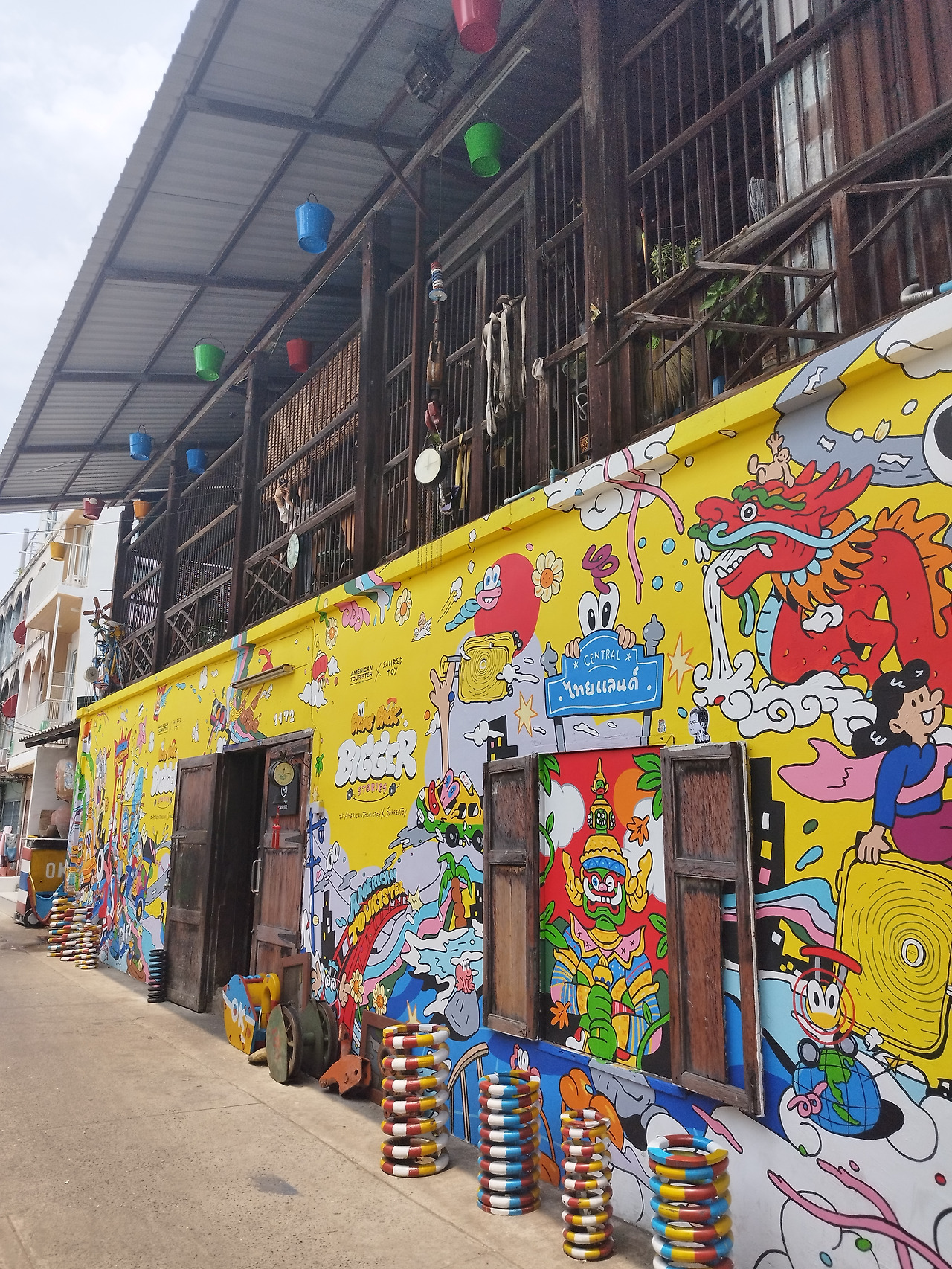 식사를 하면서, 여기가 서울의 성수니 문래동이니, 고물상을 지날 땐 옛날 청계천 같더라 하는 이야기를 하고 식사 후 커피는 어디 가서 마실까 고민하는 여행자의 점심 시간. 식사 후 카페는 태국 로컬 커피빈으로 내린 커피를 맛볼 수 있다는 '마더로스터'로 정했다. 아까 지나온 화려한 벽화 건물이 바로 카페였다.