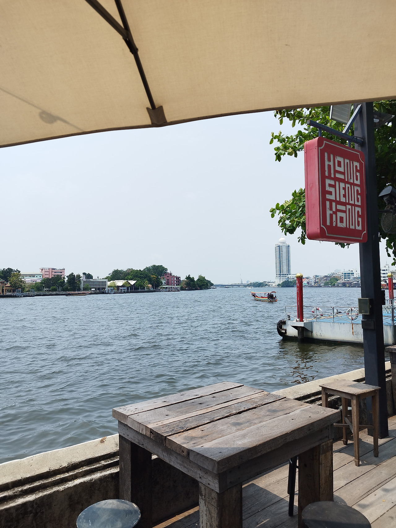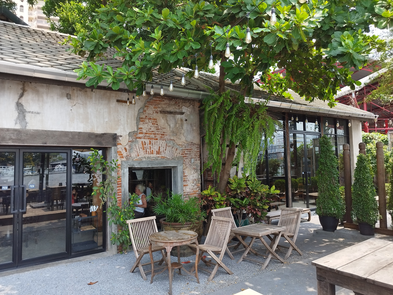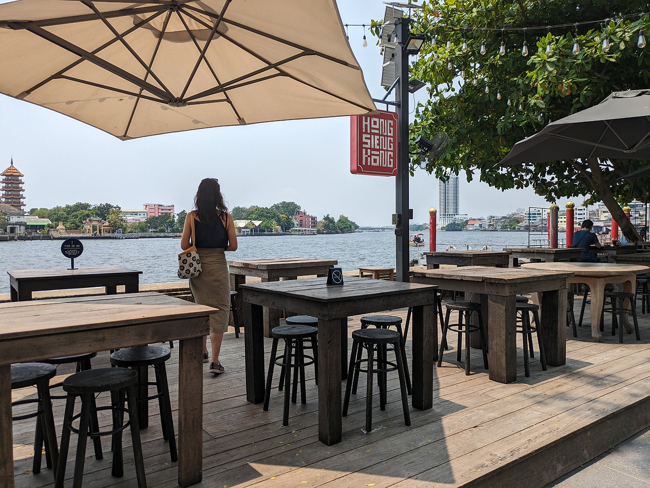 내부에서 강가 쪽으로 난 문을 열고 나가면, '짜오프라야 강'이 바로 눈앞에 펼쳐진다. 고가구로 조용하고 묵직한 느낌이던 내부와 달리 푸릇푸릇하고 밝다못해 눈부시게 뜨거운 여름날이 펼쳐지고 있는 외부.