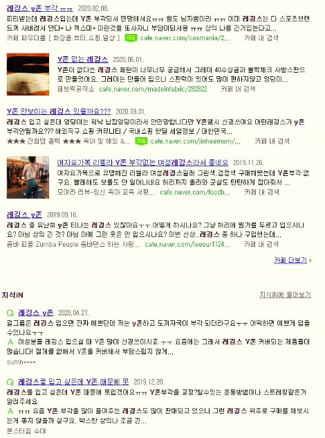 아이러니하게도 당당하게 레깅스 입을 '용기'를 북돋워주는 운동복 업체들의 광고나 홍보문구, 그리고 비슷한 제품들을 비교하는 리뷰어들에게서 답을 찾을 수 있었다. 주요 레깅스 브랜드와 연관 검색어가 되어버린 단어 ‘Y존'이 문제였던 것이다.
