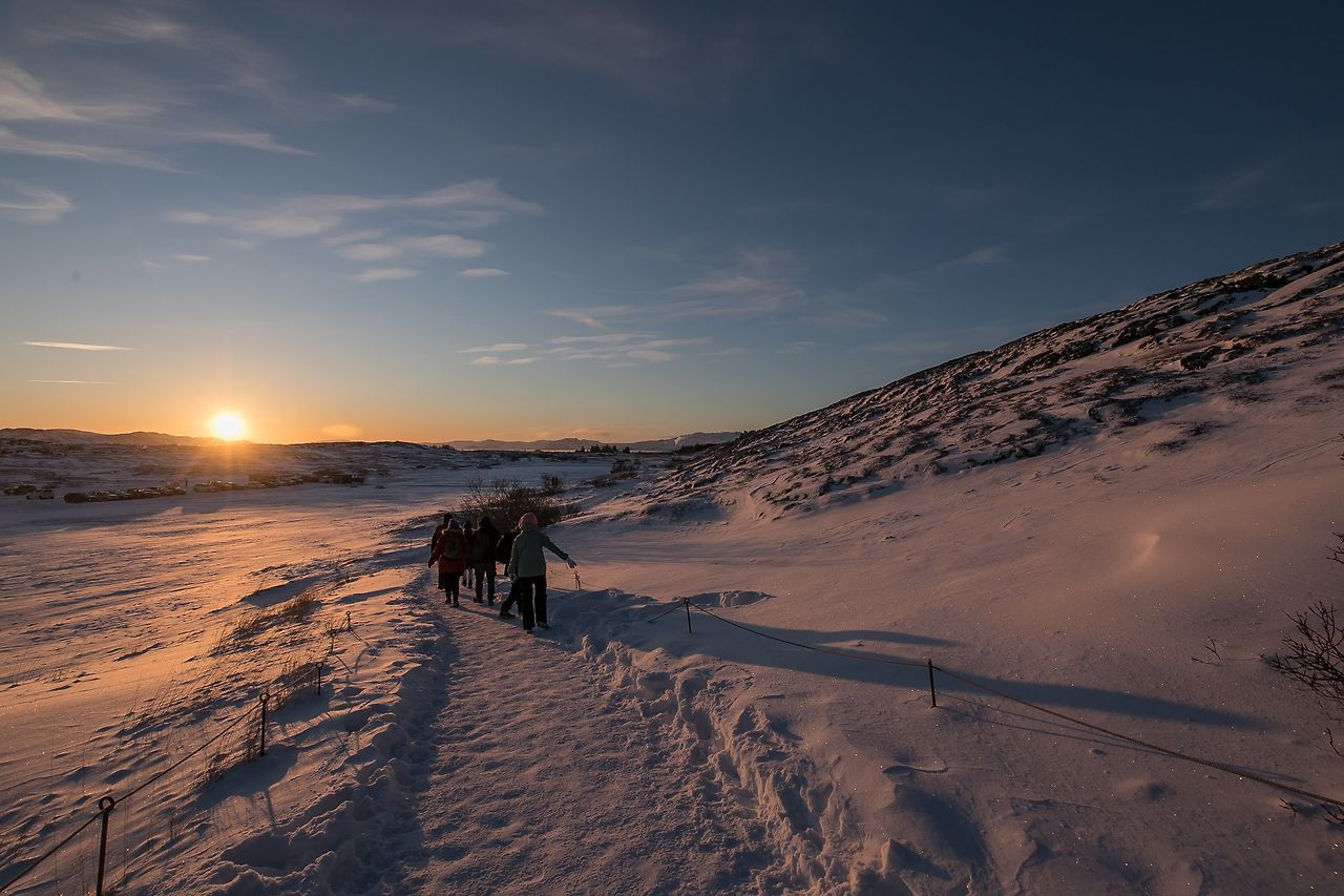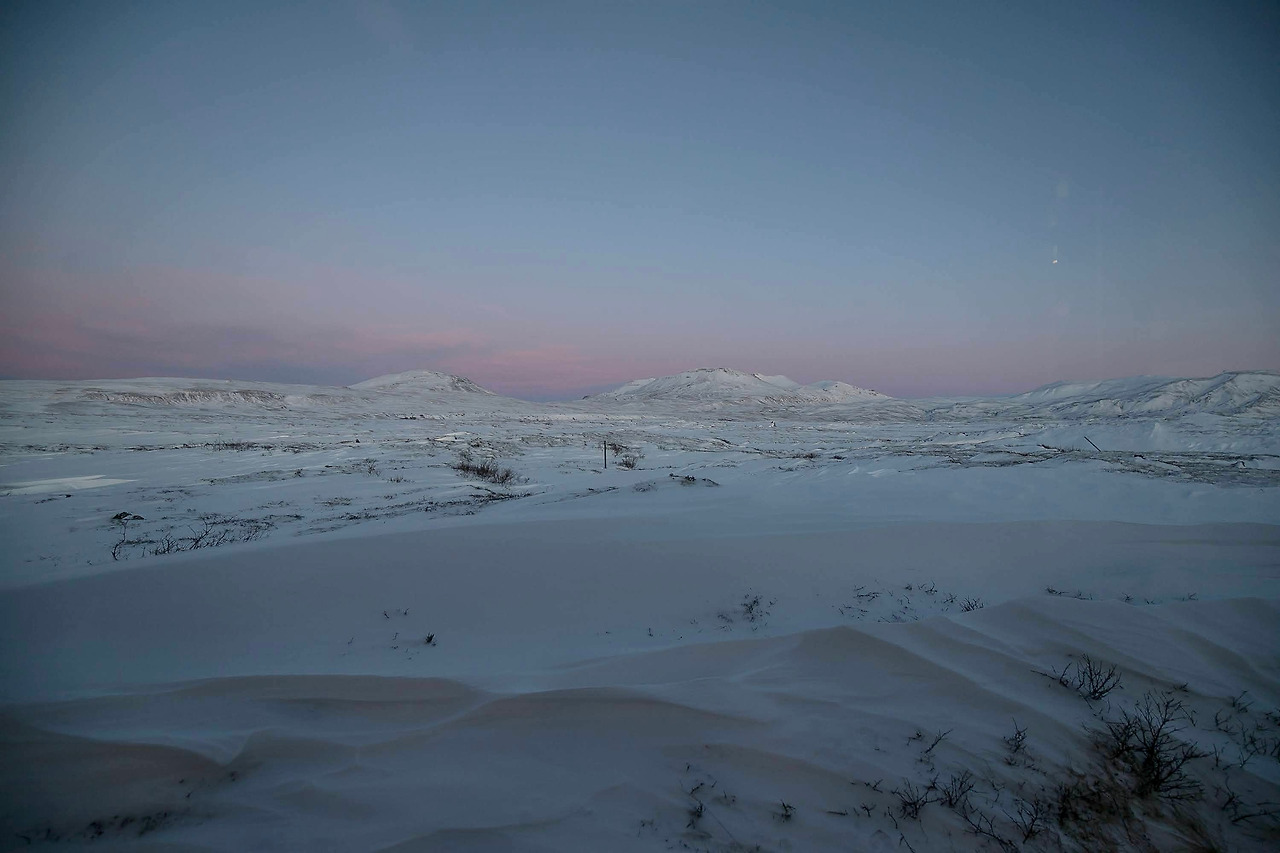 얼음의 땅이라는 이름답게 날씨 어플이 일러주는 바깥 온도는 영하 17도였다. 아주 잠깐만 창문을 내려도 칼날 같은 바람 싸대기를 맞는 상황이라 차창을 통해서 볼 수밖에 없었지만 처음 마주한 아이슬란드의 대자연에 우리 모두 감탄사를 아끼지 못했다. 뭐지, 이 처음 보는 세상은. 한참 달리다 보니 어느 순간 시야에 높은 산이 멀어지고 오렌지빛부터 보라색과 청색까지 고운 그러데이션이 지평선 위로 펼쳐졌다. '와...' 하면서 허허벌판에 차를 세웠다. 싱벨리어도 다른 어떤 관광지도 아닌, 360도로 빙글 돌아도 집 한 채, 사람 흔적 하나 없는 그야말로 '미들 오브 노웨어'에 선 우리는 저마다 스마트폰 카메라를 꺼내 들고 '다른 행성 같아'와 비슷한 말을 한마디씩 했다. 물론 지구 말고 다른 행성에 다녀와 본 사람은 없었으니 살면서 본 그 어떤 풍경과도 같지 않다는 말의 다른 표현이었는데 우리 넷의 나이를 합치면 얼추 이백 년쯤 되니까 이백 년 살면서 나름대로 여기저기 열심히 다니며 본 것들보다 멋진 벌판이었다면 조금 표현이 될는지 모르겠다.