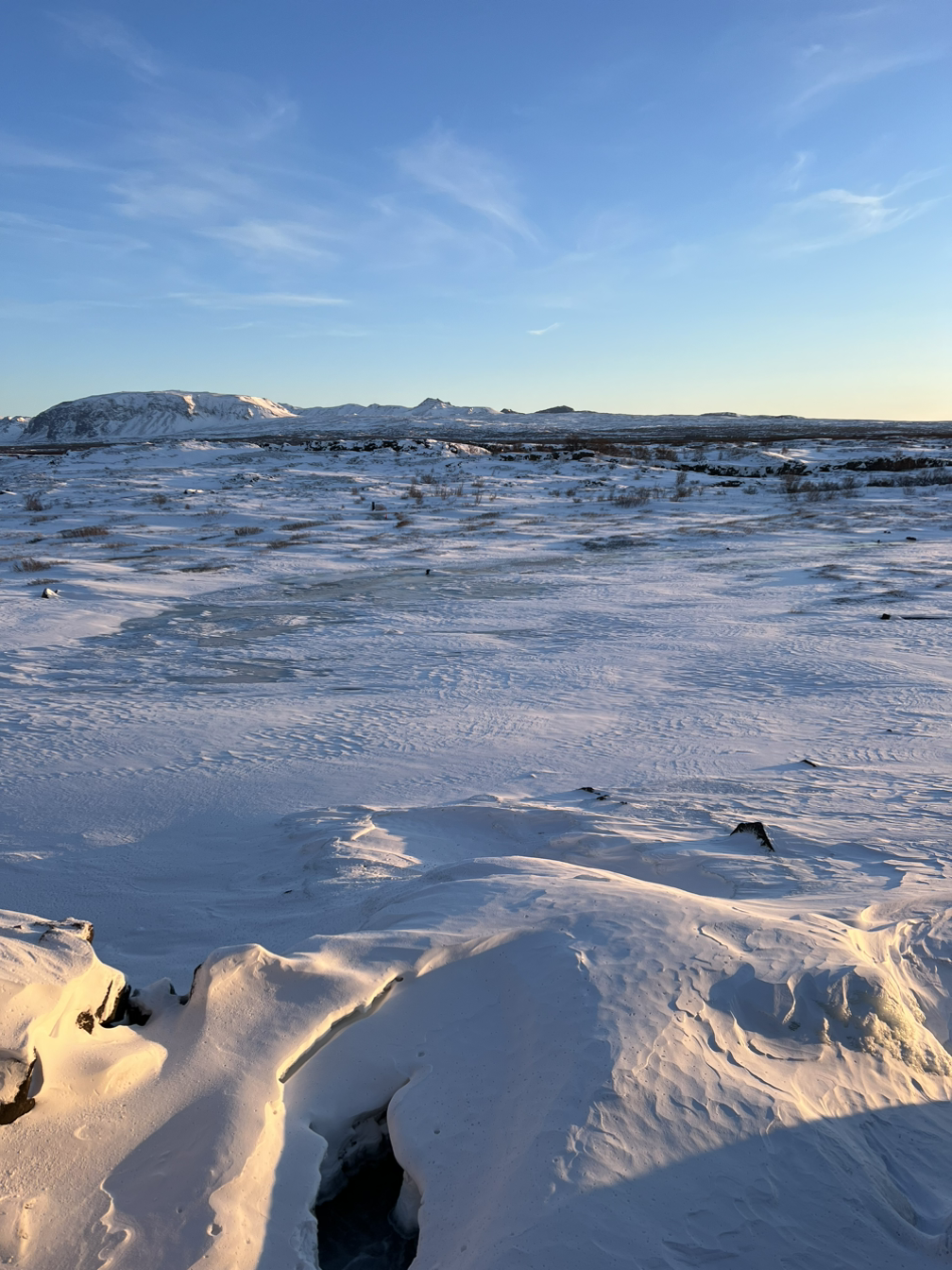 차 안에서 '우리 앞으로 계속 이런 풍경 보면서 다닐걸'이라고 현실감 주입하는 발언을 하던 반석도 손가락이 금세 얼어터질 듯 벌게지는 강추위를 견디며 드론을 띄웠다. 홀린 듯 시간을 보내던 우리는 '밝을 때 골든서클 다 둘러보고 숙소까지 이동하려면 지금 싱벨리어로 이동해야 한다'라는 타임키퍼 노라의 알람에 따라 다시 길을 떠났다.