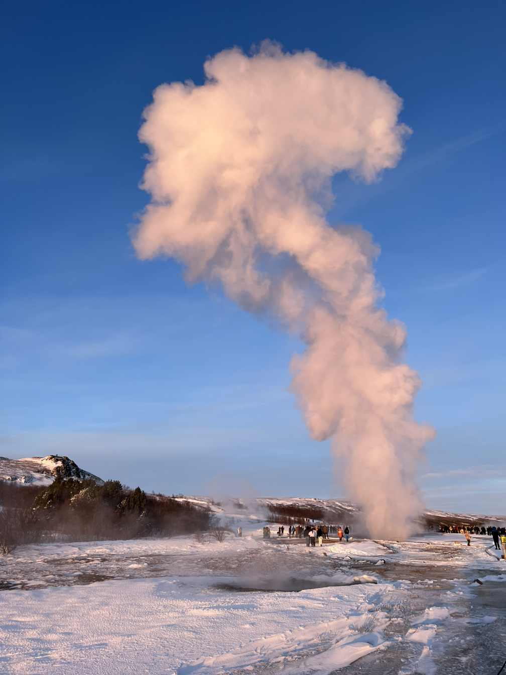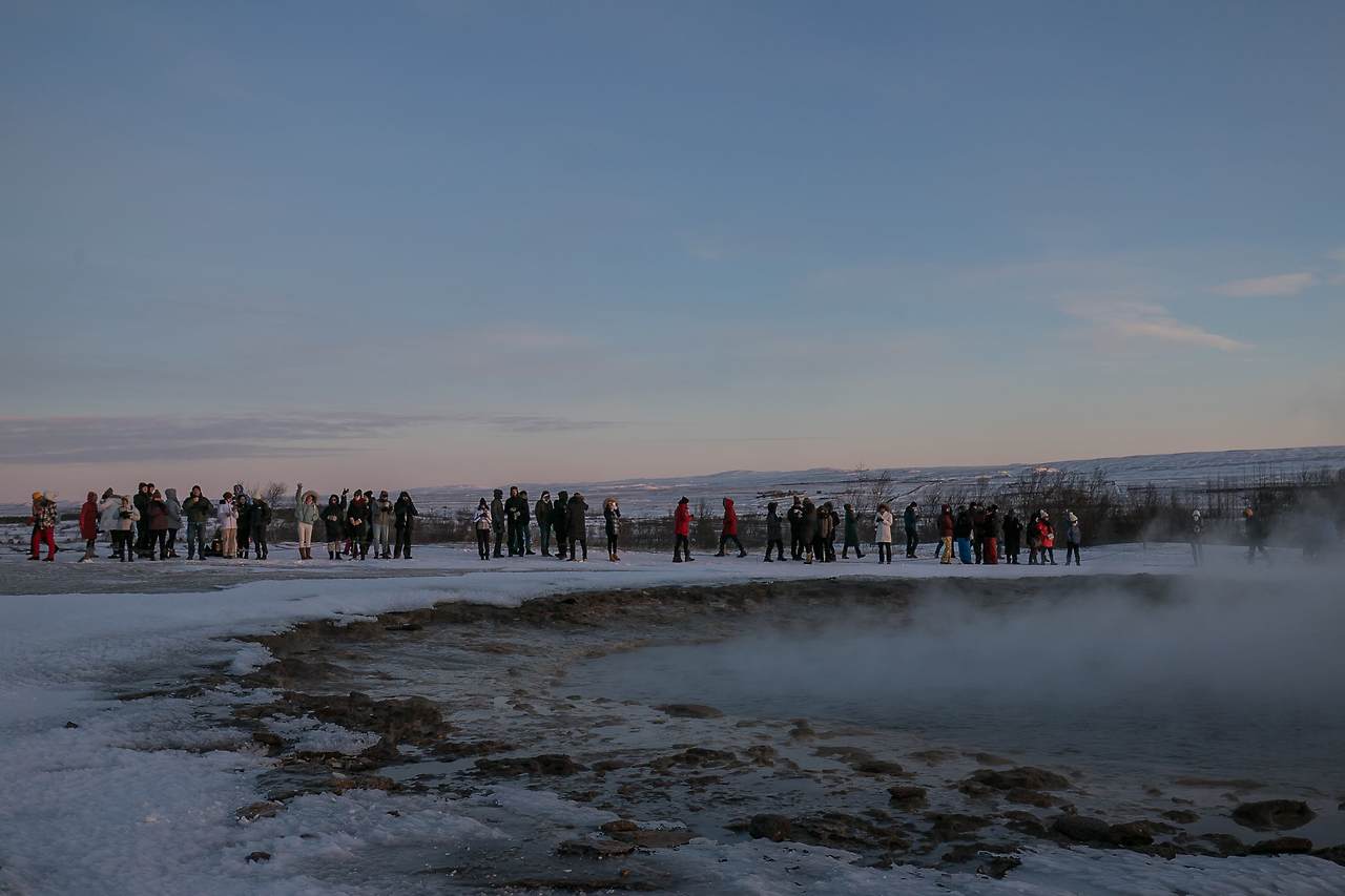 우리가 걸어가는 사이 저 멀리에서 꽤 큰 분출이 일어났다. 분수쇼의 하이라이트 같은 강한 물줄기가 하늘로 솟구치고 주변을 둘러싼 사람들의 놀란 함성이 마치 축제 같은 분위기였다. 싱벨리어에서 꽁꽁 언 몸을 차에서 잠시 녹였다가 내리니 바깥공기가 아까보다 더 춥게 느껴지기도 했다. 붉게 해가 내려갈 즈음이라 더 그랬는지도 모르겠다. 뒤뚱뒤뚱 걸음을 재촉해 사람들이 많이 모여있는 분출구 주변으로 갔다. 다들 삼각대나 셀카봉, 짐벌 등을 이용해 불시에 찾아오는 그 분출의 순간을 잡으려고 기대하며 기다리는 게 보였다. 성경에 보면 베데스다라고 하는 연못이 있는데 그 못이 한 번씩 움직일 때 병든 사람이 들어가면 무슨 병이든 낫는다고 하여 38년 간 일어설 수 없었던 병자가 그 연못가에서 물이 움직이는 것을 기다리다가 예수님을 만나는 장면에서 나온다. 사람이 들어갔다는 걸 보면 베데스다는 분명 간헐천은 아니겠지만 물이 움직이는 걸 다들 뚫어져라 쳐다보면서 언제 솟구칠까 조마조마해하는 나를 포함한 인파들이 마치 베데스다 앞에 몰려있던 사람들 같았다.