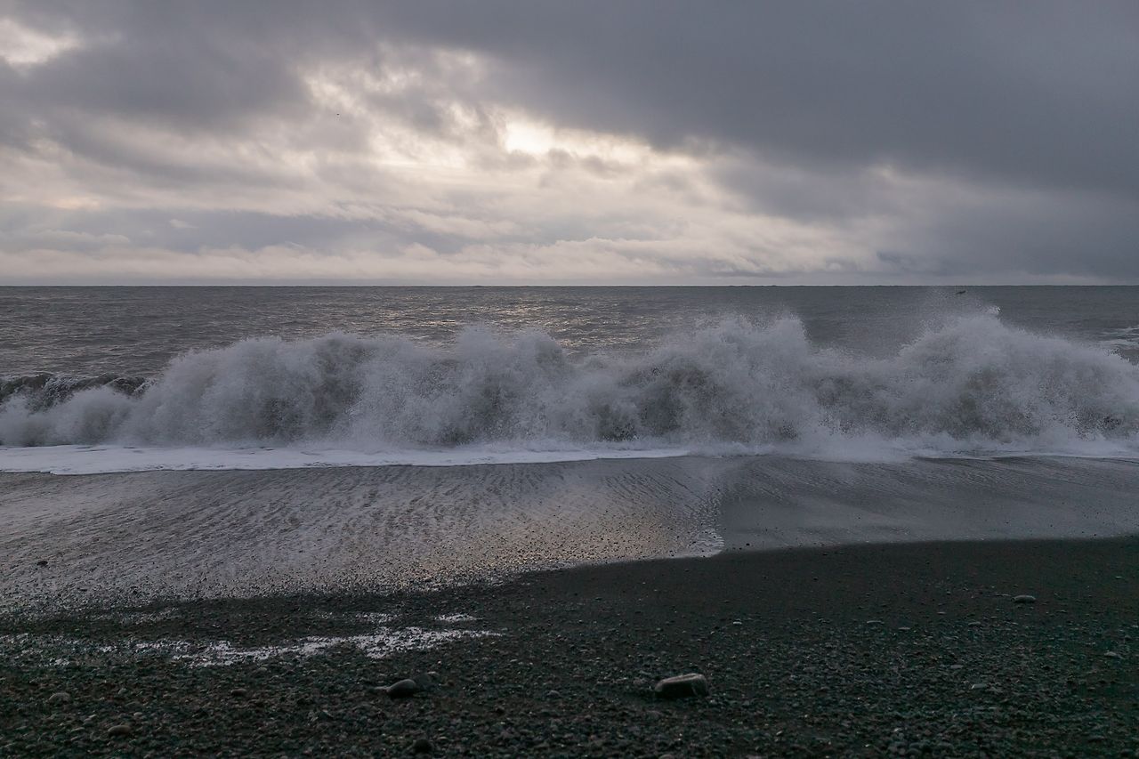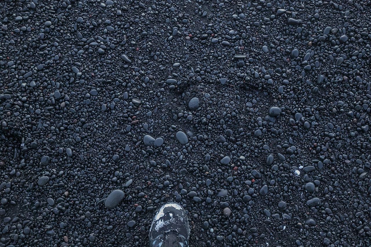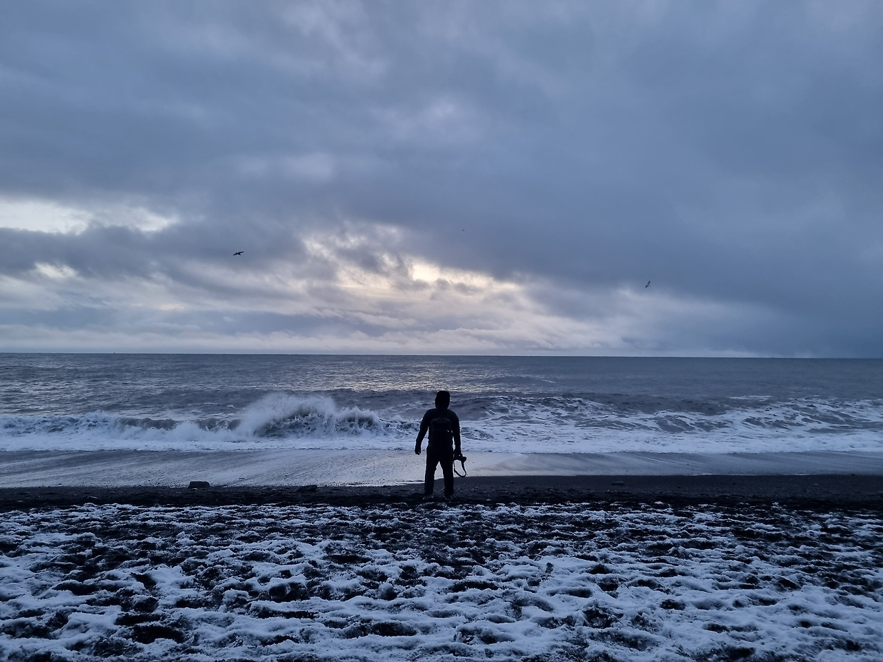 하지만 아무런 기대가 없던 레이니스파라와의 조우는 ‘아름답다’, ‘멋지다’ 정도의 언어로는 다 묘사할 수 없는 벅찬 느낌이었다. 바다가 주인공인 공간에서 그 주변 풍경 모두를 아울러 ‘바닷가풍경’이라고 말하는 게 보통이지만 왠지 여기에서만큼은 바다가 이 풍경을 구성하는 작은 일부 같은 느낌이랄까, 많은 바다를 보았지만 이렇게 묘한 바다를 마주한 적은 없어서, 내가 지금 보고 있는 풍경을 그저 바다라고 해도 될까 싶었다. 이토록 특별한 느낌을 주는 이유는 아무래도 ‘검은 모래해변’ 때문일 텐데, 제주의 ‘삼양 검은 모래해변’ 정도로 어두운 색의 모래가 아니라 현무암 색깔과 같은 검은색 흑연처럼 까만 모래고, 바다에 가까운 곳에는 동전 크기부터 주먹 절반크기까지 다양한 크기의 동글동글한 자갈들이 섞여있다. 그 까만 땅이 쌓인 흰 눈과 완벽한 대비를 이루고, 뒤편으로는 흐린 하늘이 어둑해져 가는 풍경과 함께 한 편의 흑백영화 속으로 들어온 듯했다.