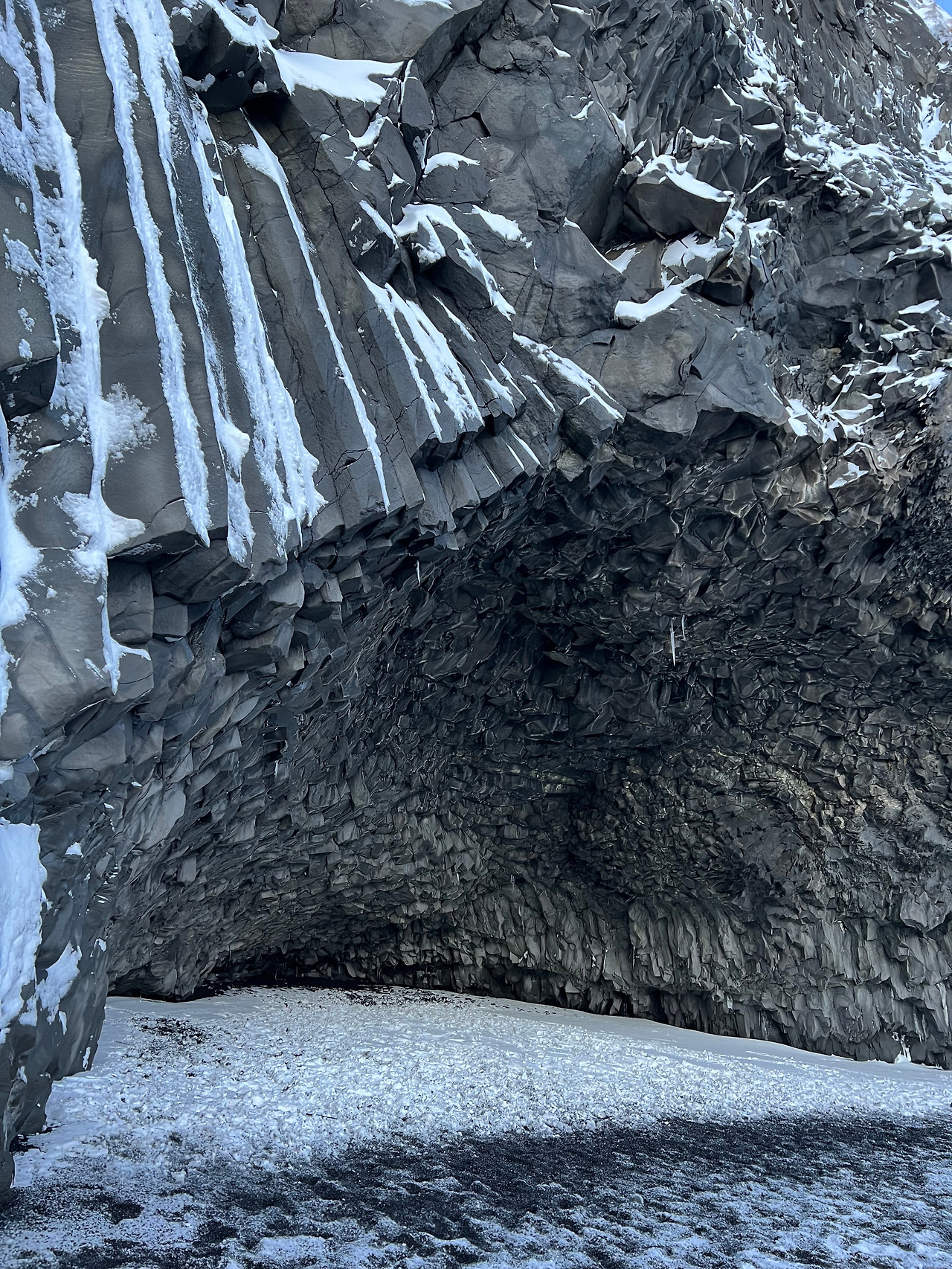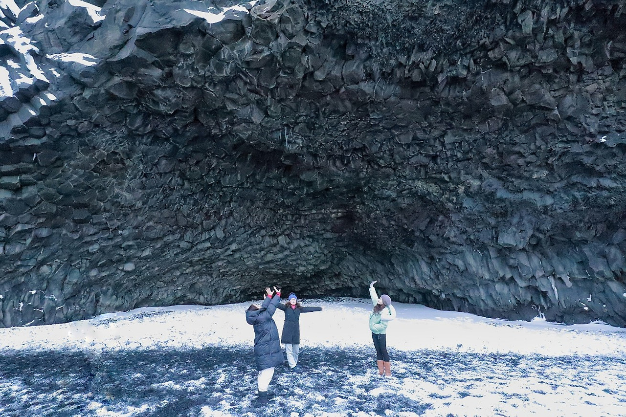 검은 해안선을 따라 걷다 보면 커다란 주상절리로 만들어진 해식동굴 할사네프셸리르 Hálsanefshellir 동굴이 바다를 마주 보며 자리 잡고 있다. 용암이 식으면서 수축되고 떨어져 나가 지금의 독특한 모습을 형성했다고 하는데, 벌집 같기도 하고, 블록 같기도 하고, 일부러 이렇게 만들려고 해도 어렵겠다 싶을 정도로 뛰어난 자연의 조형미다. 단연 압도적인 곳이라 동굴 안에 머물며 한참을 신기하게 만져보고 목이 꺾여라 둘러보며 오래 시간을 보냈는데, 사실 이곳은 파도가 조금만 세면 위험해서 출입이 통제되는 곳이라 한다. 레이니스파라 초입에 그날의 통제 상황을 나타내는 안내판과 신호등이 있다고 하던데 여기 들어갈 때는 전혀 신경도 안 쓰고 직진하느라 있는 줄도 몰랐다. 사실 그 입구에 주차등록기도 있다고 하던데 그것도 못 봐서 주차비가 공짜인 줄 알았던 우리… 무식이 용감하다고 알고 보면 경범죄를 비롯한 여러 가지 위험에 처할 뻔했지만 여러모로 운이 따라주었던 것이었다.