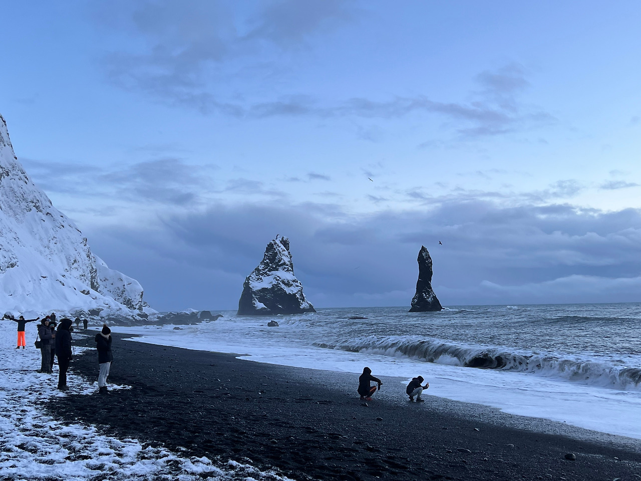 차에서 내려 몇 걸음 앞으로 떼자 회색 하늘 아래 말할 수 없이 스산한 검은 모래해변의 풍경이 압도적으로 밀려왔다. 흐린 날씨, 저무는 해, 그리고 까만 땅 위에 흰 눈. 흑백 필터를 씌운 듯한 무채색의 풍경은 고요한데, 적막을 참을 수 없다는 듯 들이치는 한겨울의 거센 파도 소리가 홀로 포효하는 이 풍경이 압도적인 감정을 불러일으켰다. 아무도 아무 말도 아무것도 하지 않았는데, 그 풍경에 에워싸이자 이유를 알 수 없는 눈물이 찔끔하고 났다. 여행 전, 우리 중 누군가 레이니스파라가 가장 기대된다고 했을 때 ‘그냥 해변 아닌가?’ 하며 대수롭잖게 지나쳤던 나였는데.