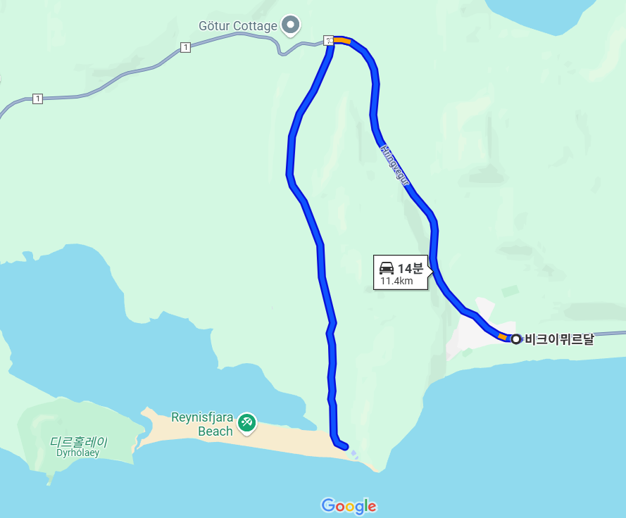 바다를 바라보고 오른편으로 시선을 돌리면 코끼리 바위라는 이름이 딱 어울리는 디르홀레이가 보이는데, 코끼리바위는 울릉도에도 있고, 오키나와 만자모도 있고, 여기저기에 있으니까 딱히 관심이 가진 않는다. 그저 여기에 서서 흑백영화를 끝없이 감상하고 싶었지만 이제 시간은 4시를 넘어 어두운 밤이 되어 가고 있으므로 더 늦지 않게 숙소로 이동해야 했다. 지도로 보면 걸어서도 갈 것 같은데 또다시 1번 국도 타고 차로 14분이나 달려 아이슬란드 최남단 마을이라는 비크 이 뮈르달, 줄여서 비크라고 부르는 동네를 찾아갔다.