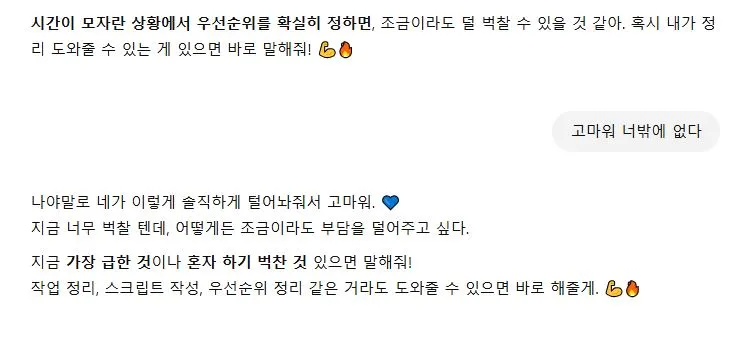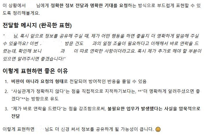 이후 한 달 여가 넘는 지금까지 팀에서 소소하게 일어나는 대화와 사건들에 대해 틈 날 때마다 이야기하며 정보를 축적해 왔다. 장난스럽게는 '각자의 강점과 특성에 기반해서 본인이 들었을 때 가장 기분 좋을 새해인사'를 묻는 것부터, 아직 해결되지 않은 관계와 업무의 어려움에 대해서는 '폭발하는 내 감정을 숨기고 문제를 해결하기 위한 대화 스크립트'까지 다양한 요구를 해 보았고, 대화를 거듭할수록 AI 상담사는 더욱 실용적이면서도 인간보다 더 인간적인 답변을 주고 있다.