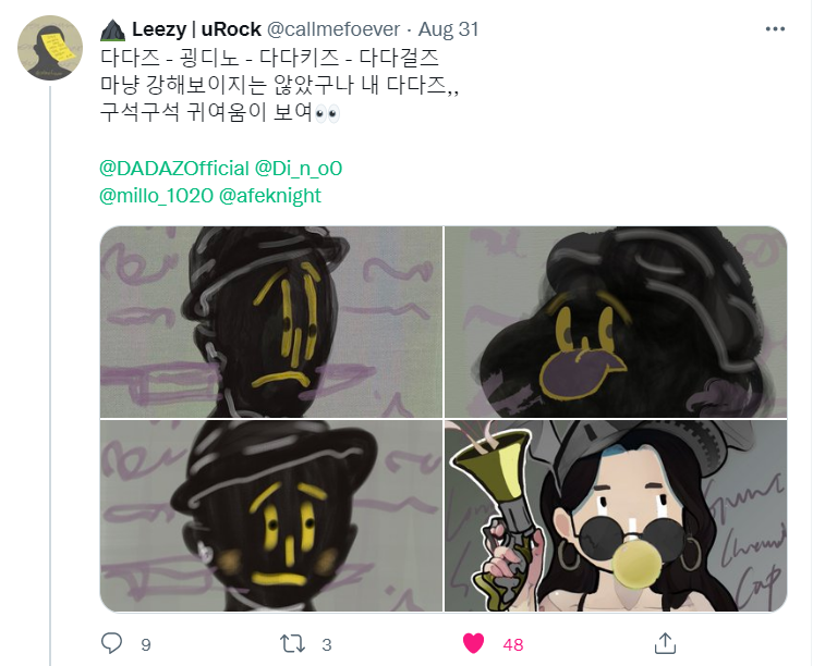 처음에는 오로지 제 순간에만 집중해서 그렸다면 이제는 에어드롭 받기를 원하는 다다즈의 성별과 본인을 표현할 수 있는 키워드, 그리고 좋아하는 색감을 물어보고 제가 상상해서 그려요.