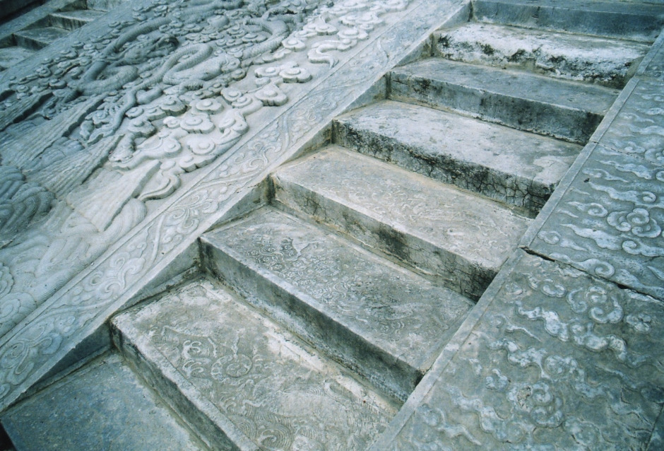 아래에는 청회색의 돌계단. 구름과 상징적인 동물들이 정교하게 조각되어 있다.