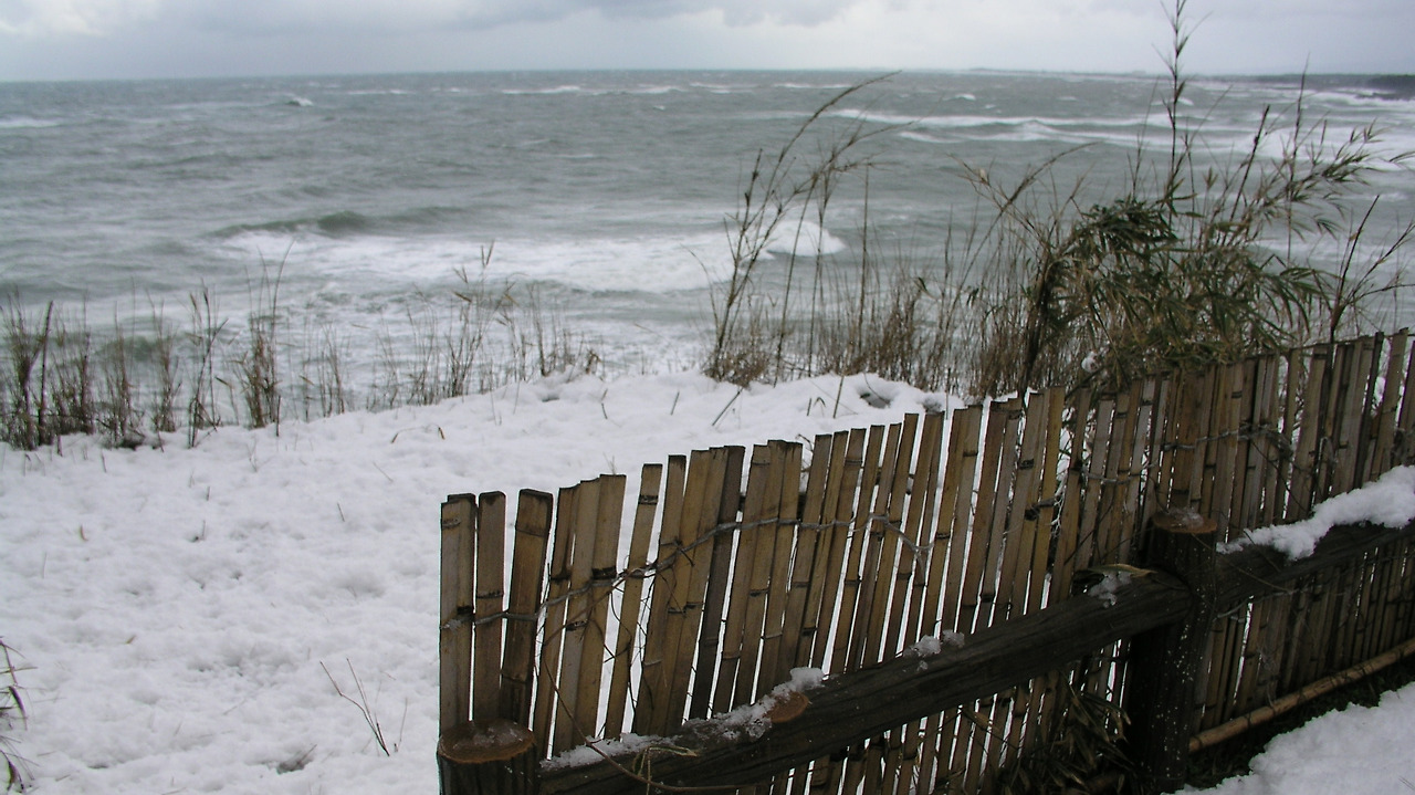 이 높은 절벽 해안에는 대나무로 만든 울타리가 있었다.