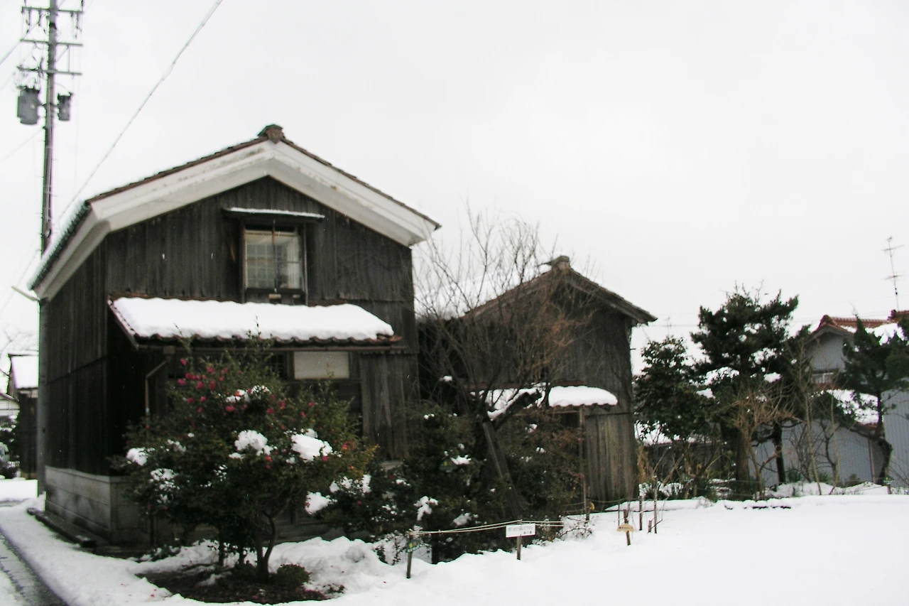 지붕과 처마에 쌓인 흰 눈으로 더 어두워 보이는 삼나무 가옥 앞 작은 나무