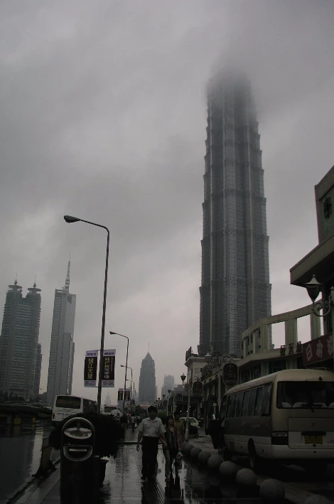 상부 원형 장식에서 사다리꼴로 설계 변형되었다는 그리고 짓고 있던 SWFC 상하이 월드 파이낸스 센터, 그 외 안개와 운무로 SF 속에 와 있는 듯한 느낌을 주던 여러 건물들이 멀리 보인다.