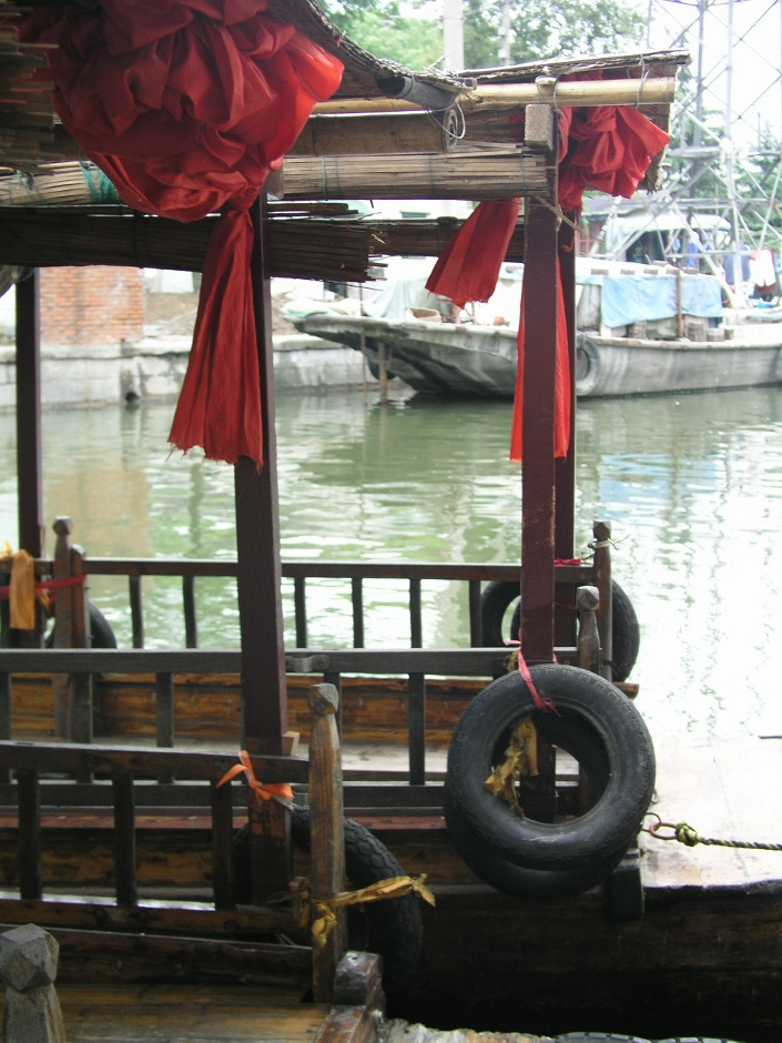 배 지붕과 기둥이 만나는 곳에는 붉은색 천으로 장식을 해 두어 중국 전통적인 분위기를 느낄 수 있다.