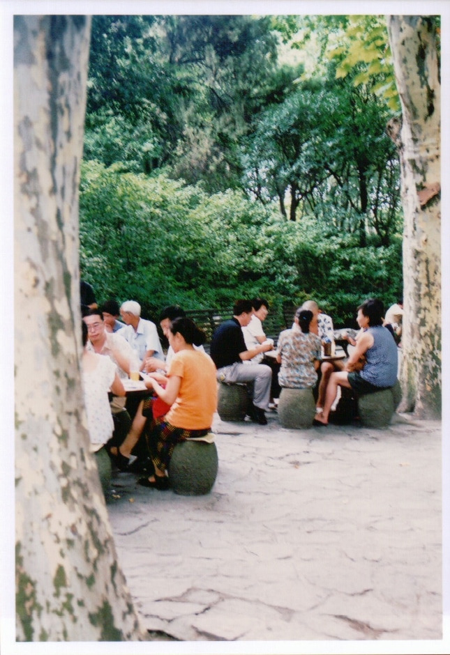 둘러앉아 차를 마시며 대화를 하거나 장기를 두는 중국 시민들의 일상이 테이블과 의자에.
