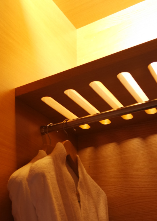 옷장을 열면 툭툭한 상당한 두께의 하얀 면 타월 가운이 반들반들 표면을 다듬은 질 좋은 목재 옷걸이에 다소곳이 걸려있다. 아래로는 간이 다림판이 있기도 하고 옷걸이만큼이나 고급스러운 원목 옷솔과 구두의 먼지를 털어낼 부직포, 세탁물 주머니 등이 또한 가지런히 놓여있다. 비즈니스 출장도 아니고, 세탁물을 맡길 일이 거의 없었지만 옷을 간편하게 한 벌 정도의 여벌만 가져갈 경우 이용해도 좋겠다 싶은 마음이 들지만 여간해선 그럴 일이 생기지 않았다. 여행 자체가 짧으니까 대체로. 옷장은 밀어서 열면 안에 전구가 달려있어 켜졌다가 닫으면 꺼진다, 냉장고처럼.