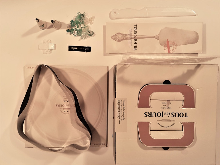 상자 안을 열어보면 케이크 받침대가 있다. 받침대는 종이로 되어 있고, 케이크 이탈 방지를 위한 것으로 보이는 중심 지지대가 있다. 작은 케이크에는 중심축 지지대는 안 넣는 것 같다.