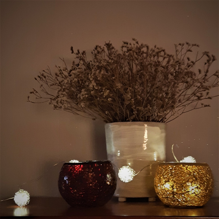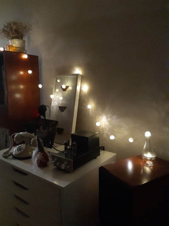 줄전구를 작년에는 초를 켰던 캔들라이트에 걸쳐놓으니 초를 켠 효과도 나서 기대 이상이다. 하나는 점멸 기능도 있어 음악과 함께 하면 리듬감이 배가된다. 초승달 모양의 줄전구는 은은하다.