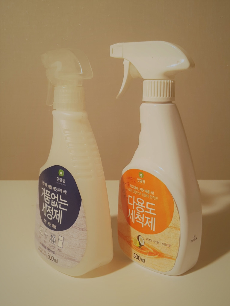분사나 펌핑 방식의 세제 중 왼쪽 제품은 리필을 판매하지 않았다. 이온 운운하는, 다소 특수하게 제작 보관되어야 하는 제품이어서 그런 듯한데. 성능이 매우 뛰어났으나 리필이 없어서 두 (세?) 번 정도 구입하고 더 이상 사지 않는다. 다 쓰고 남은 용기는 깨끗이 씻어서 분무기가 필요할 때 사용하려고 한다.