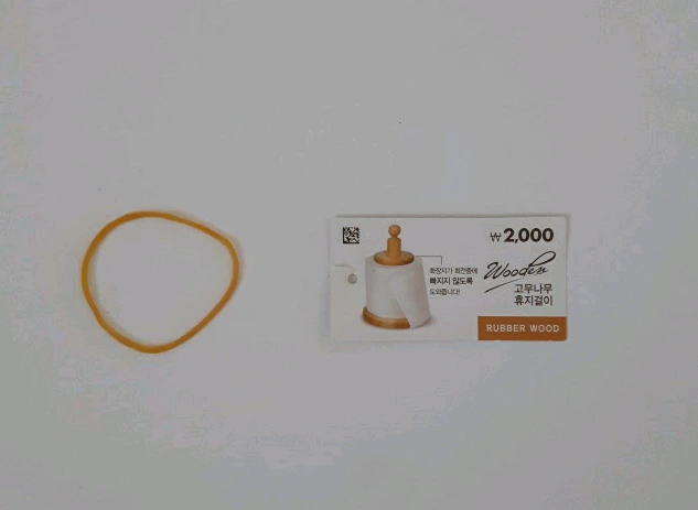 동네 다이소 매장에 갔다가 원목으로 제작된 휴지 걸이가 있어 사왔다. 이 물건의 빛나는 점은 한 두 가지가 아니었다. 가장 좋은 점은 고무나무로 만들었다는 점이다. 사용도 간단하고 편리했다. 이에 더해 포장이 정말 심플했다. 아니 포장이랄게 없었다. 상표는 고무 줄 한 가닥에 연결되어 있었다.