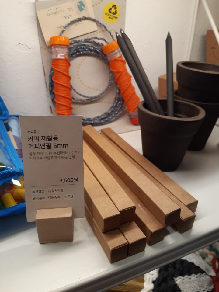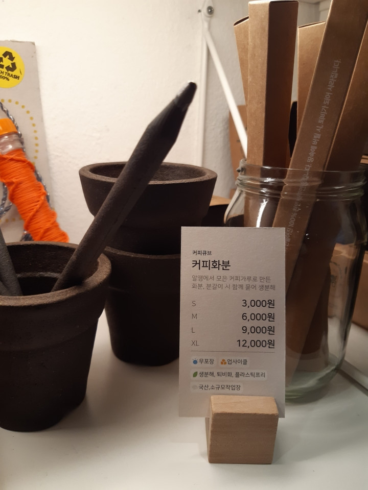 더 반가운 소식. 원두 커피 찌꺼기를 가져오면 이걸로 화분과 연필을 만드는 업체에 넘겨준다고. 기분이 좋아서 또 기억할 겸 커피 연필 한 자루 사왔다. 커피 주간 이후로 커피를 조금씩 줄이려고 하고 있지만, 선물로 훅 들어오는 원두, 남아 있던 원두 다 먹으려면 또 한참이니 이왕 있는 원두, 맛있게 마시고 원두 내린 후 찌꺼기는 이곳에 가져오면 되겠다.
