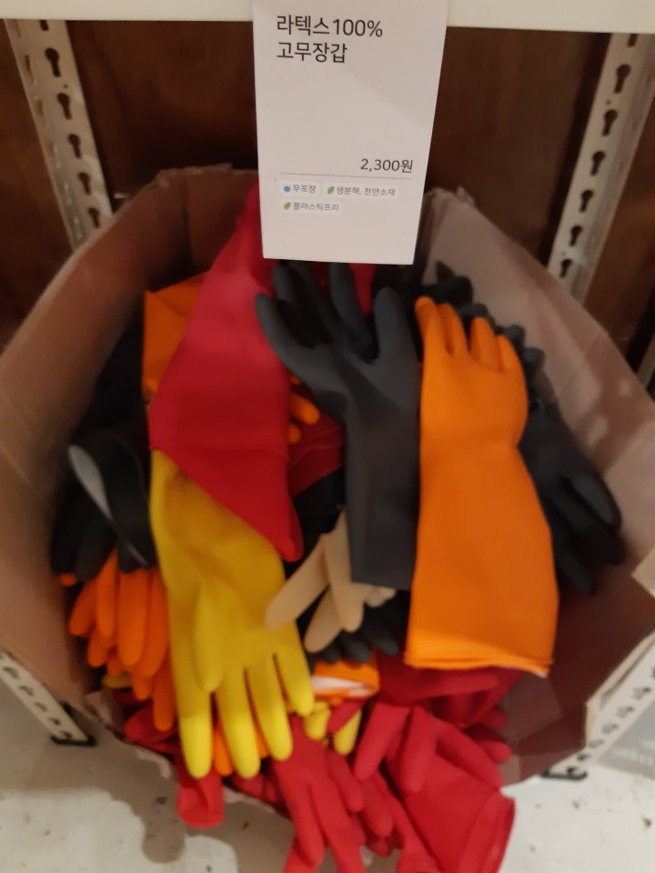 다회용 포장지도 있고, 100퍼 천연 라텍스 고무장갑도 있었다. 포장이 없어 더 좋다. 여기는 알맹상점이니까.