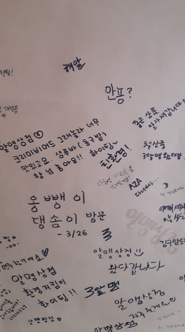 알맹상점에 감사하는 손편지들이 전시되어 있다.