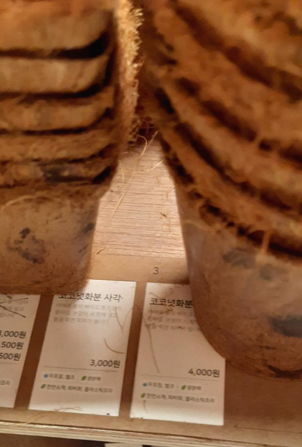 플라스틱 화분이 대부분, 도기는 너무 무겁던 차에 코코넛 화분을 이 곳에서 알게되었다.