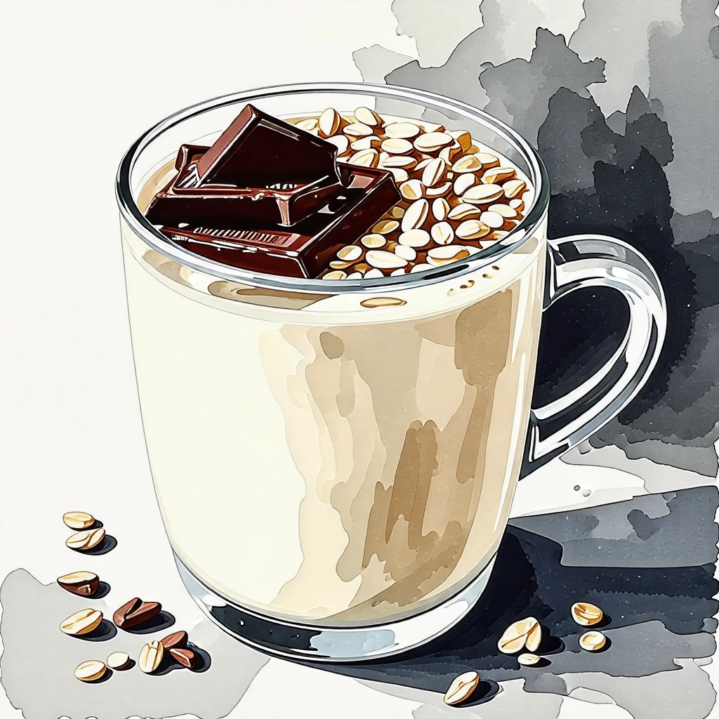 배경음식. 오트밀과 다크초콜릿이 올라간 따뜻한 우유
