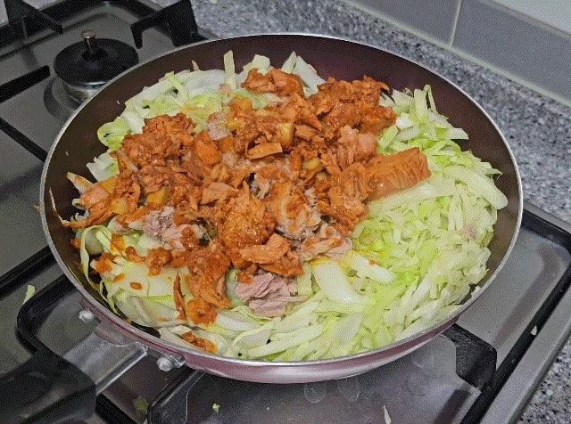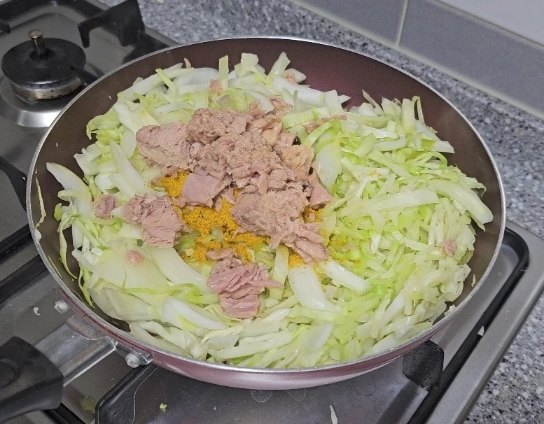 채 썬 양배추 6 주먹, 양파 1.5개, 계란 1개(한끼), 카레가루 6스푼, 굴소스 3스푼, 캔참치 큰 거 3캔