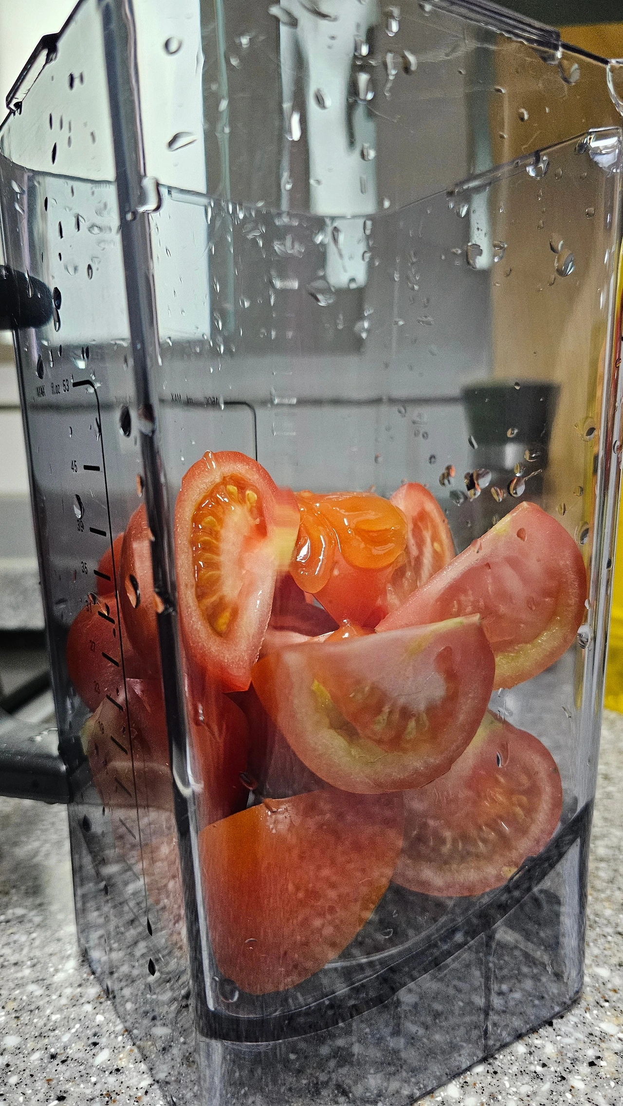 블렌더 작동 직 후 토마토에 얼음도, 물도 하나도 안 넣고 갈아버린 게 생각났다.