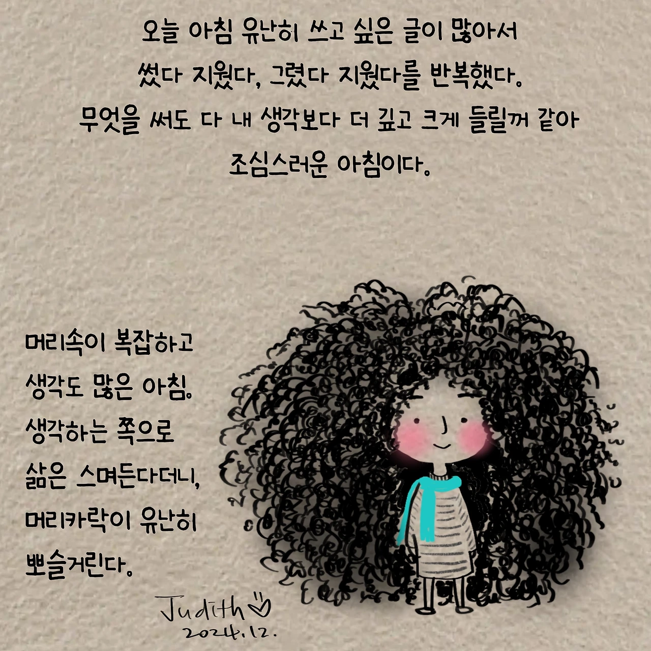 글쓰고 그림그리고 음악을 연주하고.. 아직은 펜과 물감이 좋은 사람입니다. “새벽 5시 책상앞, 쥬디스 그림일기“ 출판하였고, 언젠가 나왔으면 하는 2편을 준비중입니다.