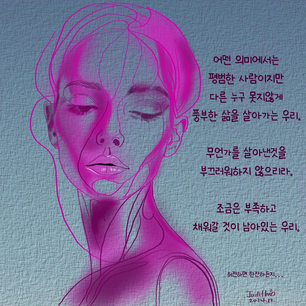 글쓰고 그림그리고 음악을 연주하고.. 아직은 펜과 물감이 좋은 사람입니다. “새벽 5시 책상앞, 쥬디스 그림일기“ 출판하였고, 언젠가 나왔으면 하는 2편을 준비중입니다.