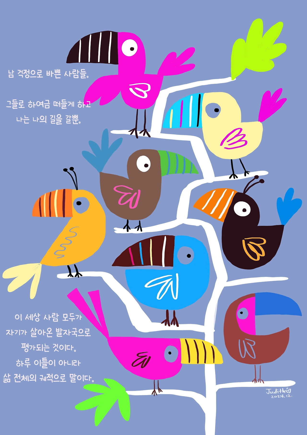 글쓰고 그림그리고 음악을 연주하고.. 아직은 펜과 물감이 좋은 사람입니다. “새벽 5시 책상앞, 쥬디스 그림일기“ 출판하였고, 언젠가 나왔으면 하는 2편을 준비중입니다.