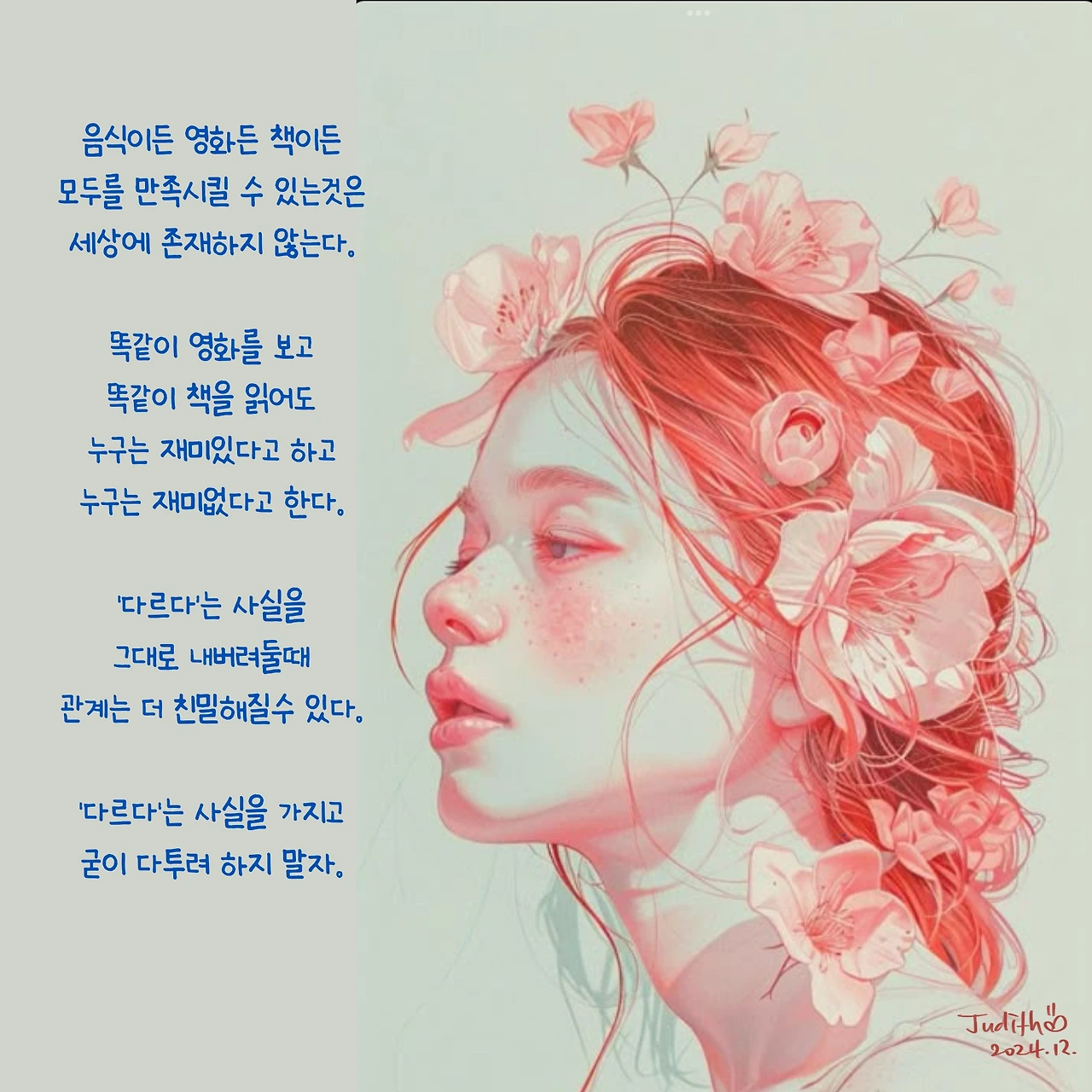 글쓰고 그림그리고 음악을 연주하고.. 아직은 펜과 물감이 좋은 사람입니다. “새벽 5시 책상앞, 쥬디스 그림일기“ 출판하였고, 언젠가 나왔으면 하는 2편을 준비중입니다.