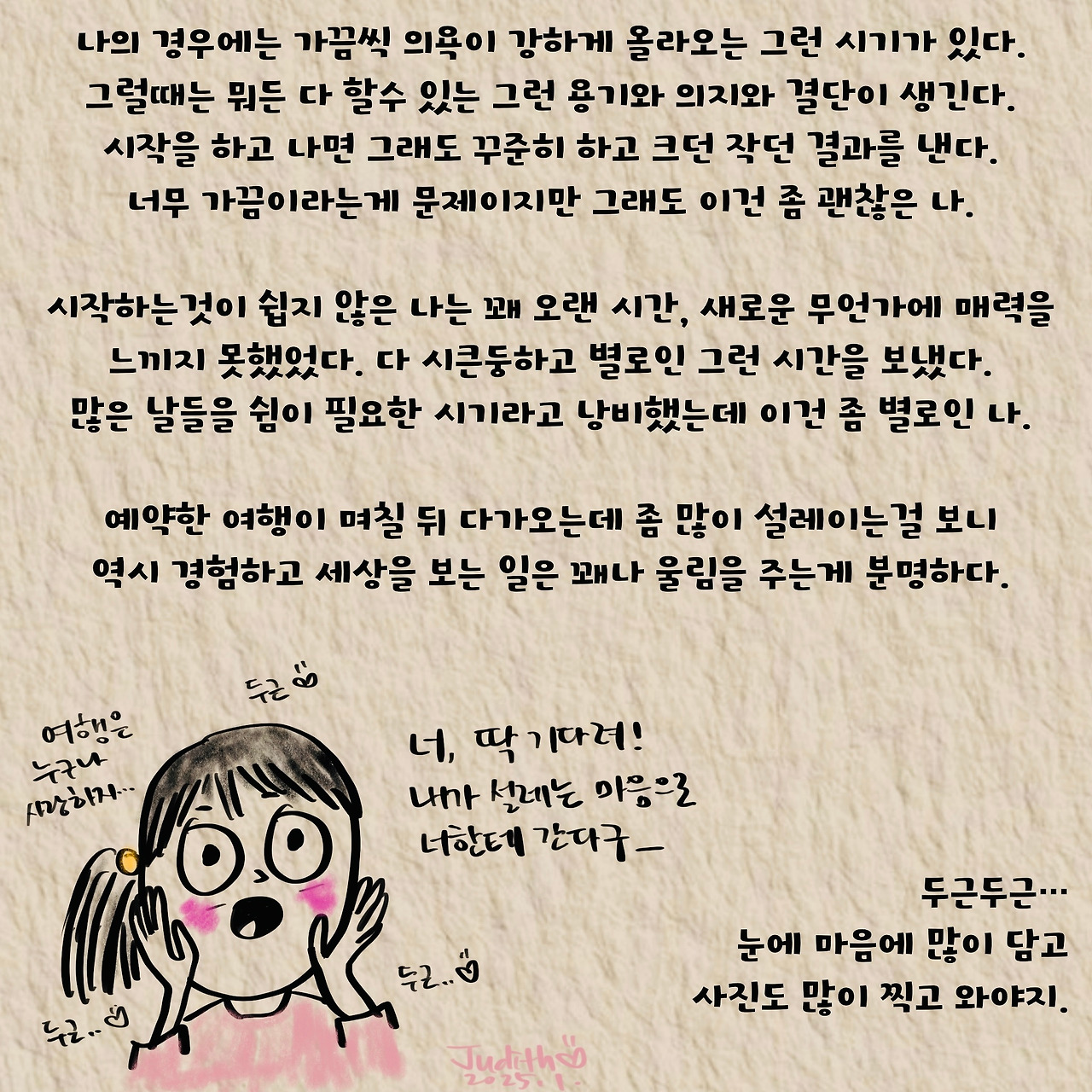 예약한 여행이 며칠 뒤 다가오는데 좀 많이 설레이는걸 보니 역시 경험하고 세상을 보는 일은 꽤나 울림을 주는게 분명하다. 여행은 누구에게나 설레이겠지만 나도 좋아.