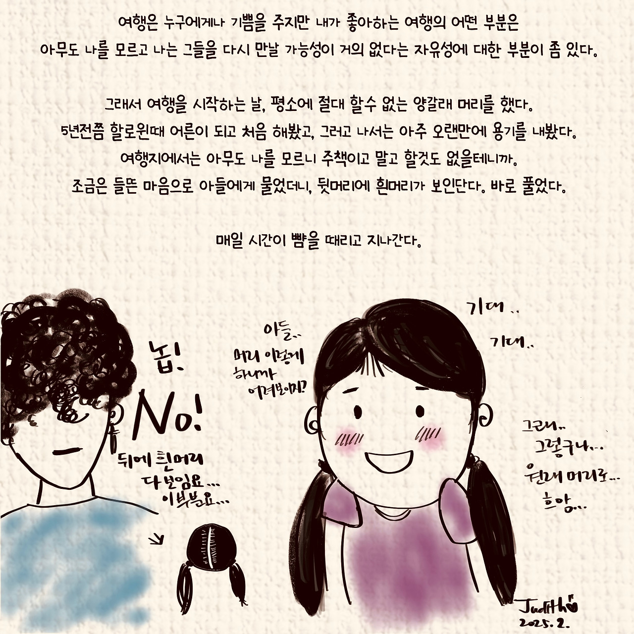 평소에 절대 할수 없는 양갈래 머리를 했다.